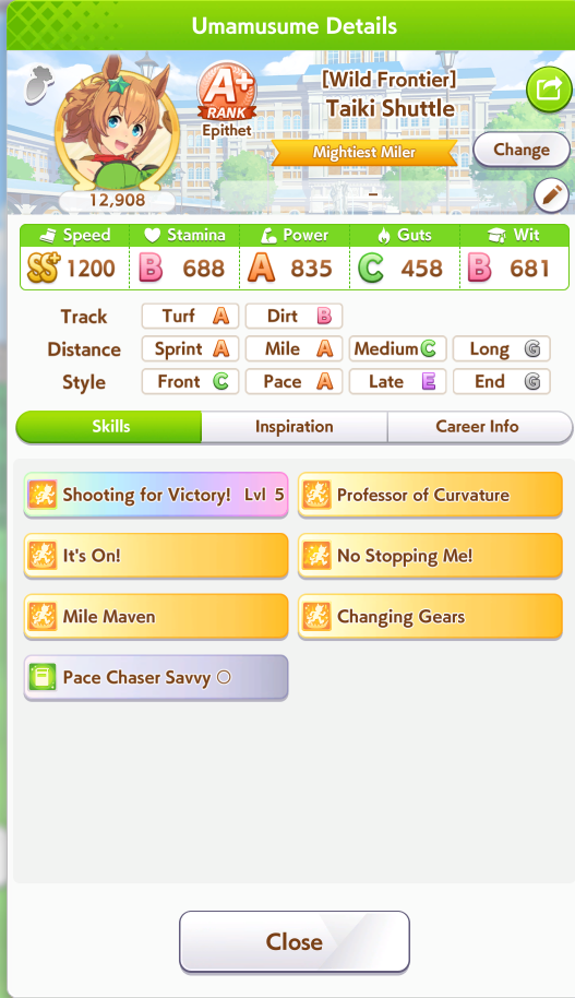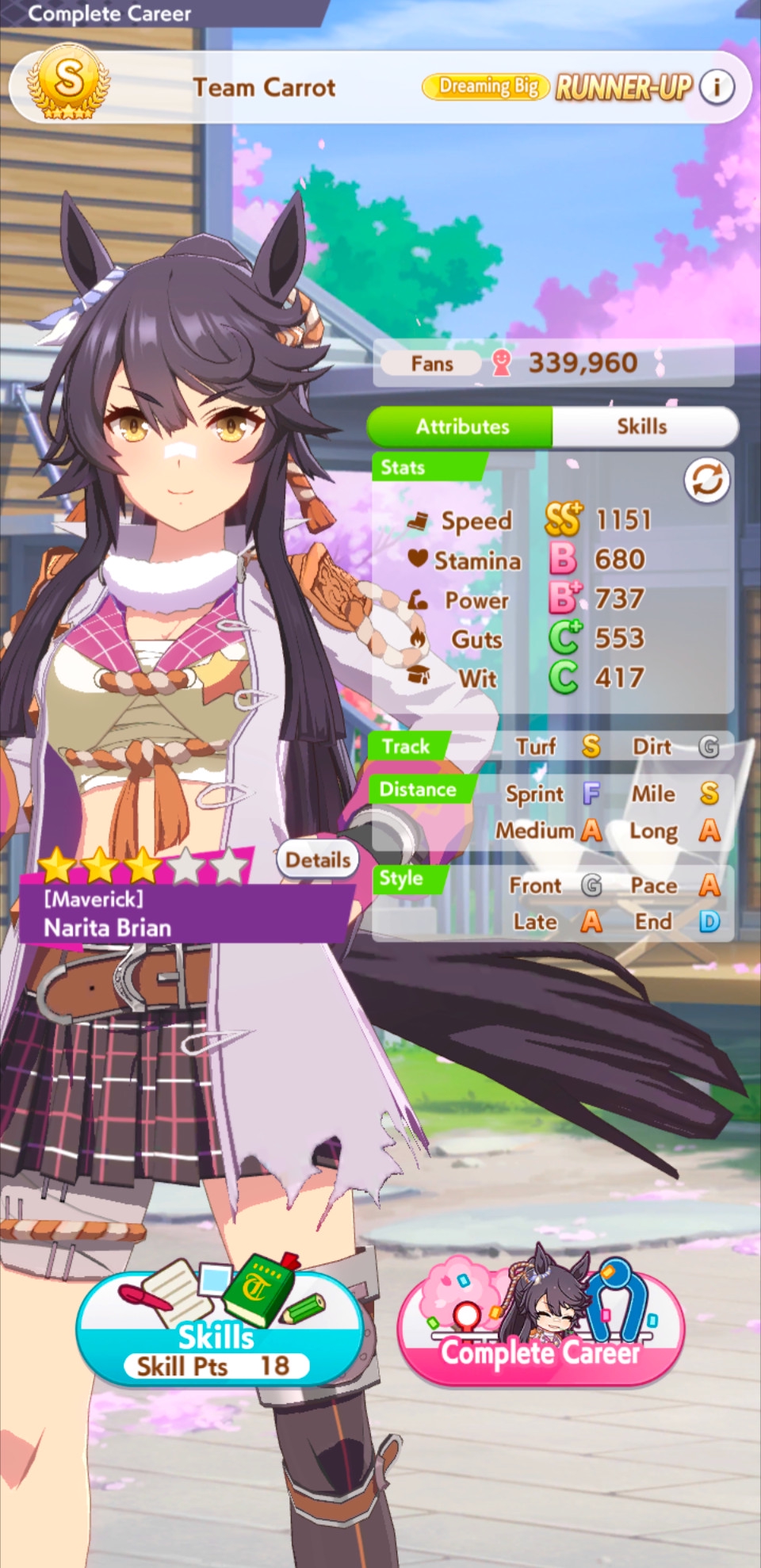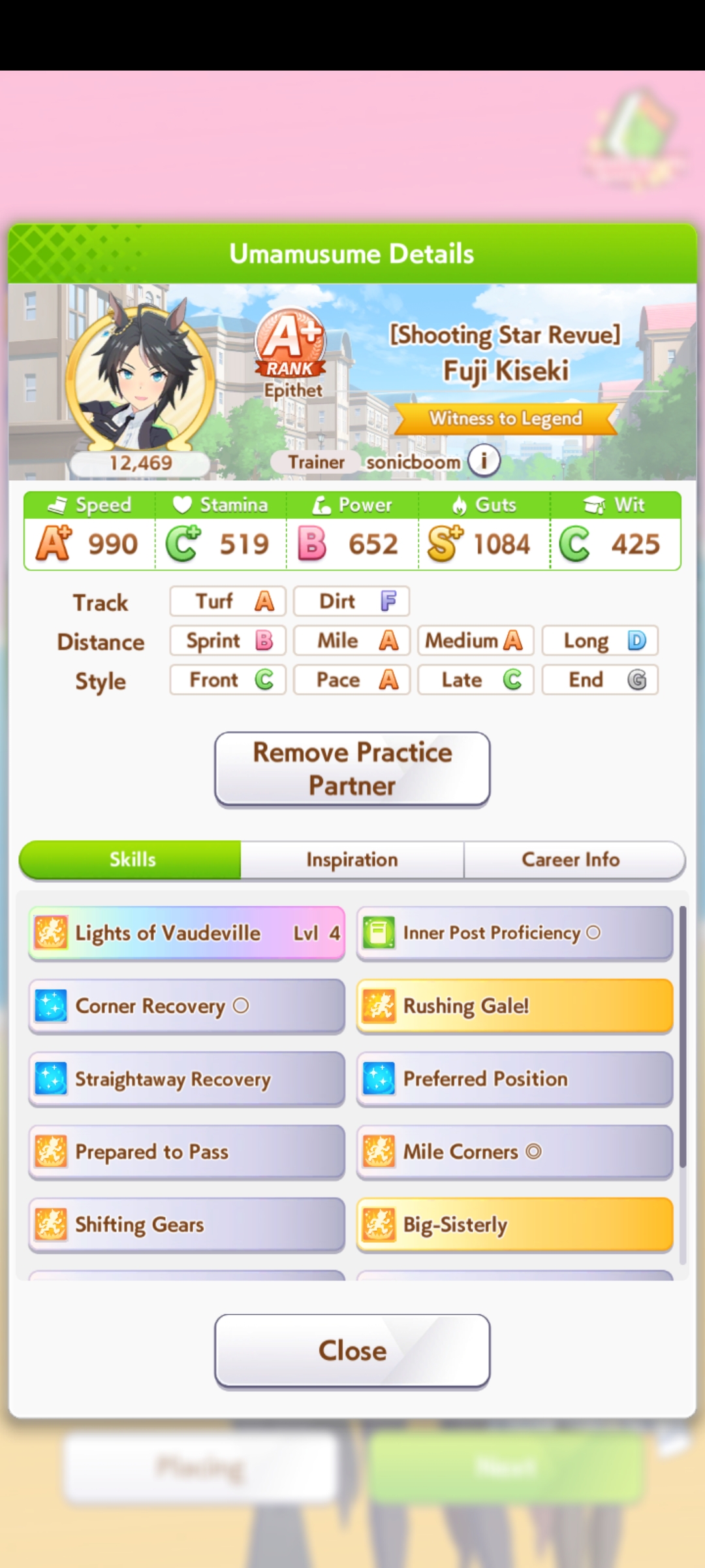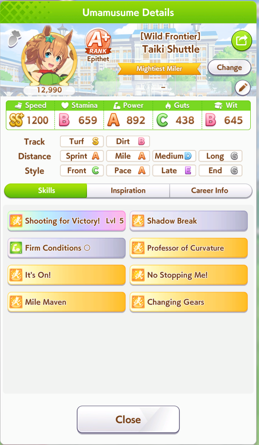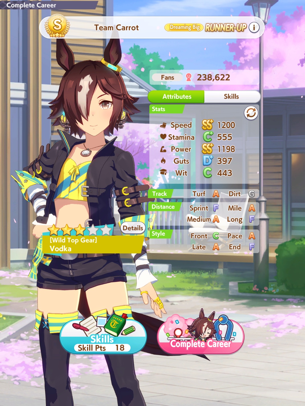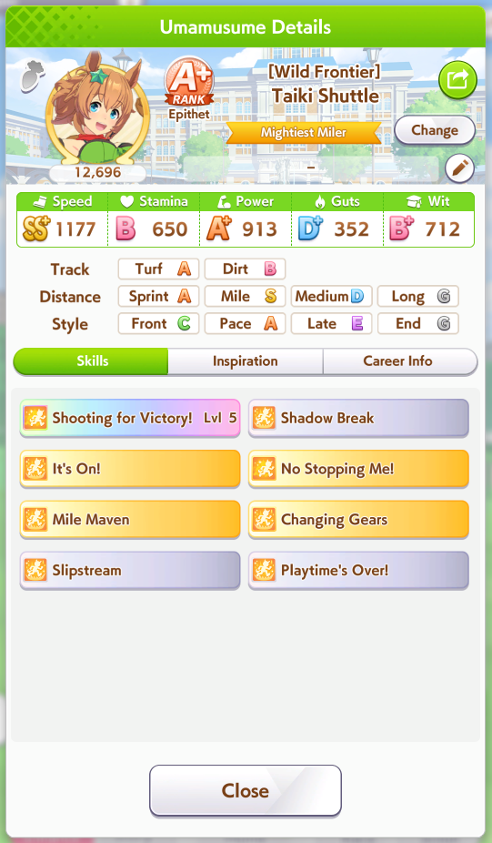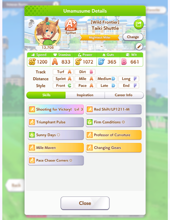Ну такое зачем-то пролез в А лигу, когда после семи просёров подряд мои умы зачем-то побеждать решили. Ну правда первые пять можно сказать не основной состав бегал, так взял тех кто не очень вышел чисто посмотреть. Но ебут прямо жестко, это да. Если меньше 1к спида и 500 гатса, то лошади прямо отлетают на финише. Пару раз моя Спе прямо на ногтях первое место выцарапывала. Ей бы статы конечно по больше чуть-чуть, а так только надеяться что у противников ускорялки поздно включатся из-за низкого вита или бад муда. Ну и Грув один раз даже победила, еще бы ей самой бэд муд по реже кидало, так то единственная моя А+ в принципе, но бежит она странно. Постоянно отстаёт чуть ли не до лэйтеров и бежит в конце пака, особенно когда в забеге куча пэйсеров. Понял кому тот навык с карточки Браян подойдёт, ей точно, а то задолбала в конце бежать делая вид что она лэйтер, можно ей еще и помп айрон взять ради лулзов тогда лол, гемблить так гемблить. Посмотрим. По хорошему надо перекачивать хотя бы половину тимы, а лучше всех, но не уверен что смогу.