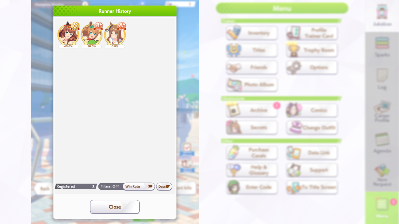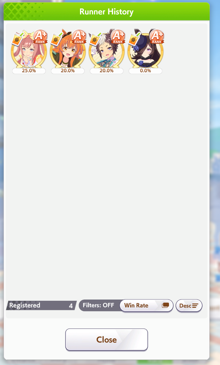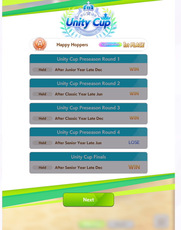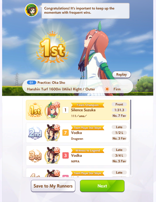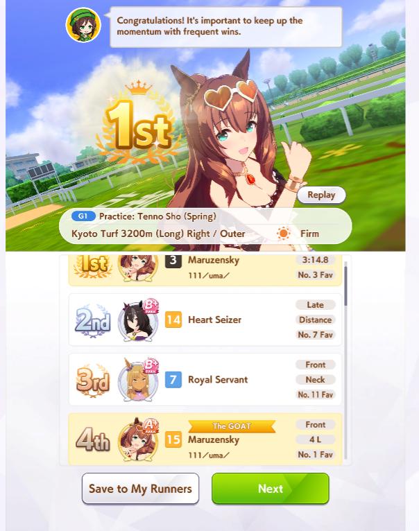 Вглядитесь в это одухотворённое лицо. Так выглядит победитель! в 30% случаев, но топ 2 во всех 60% Ну такое, рандом ебаный, ненавижу милю. Попадёшь ты в коробку или нет. А+ одни, с А даже не суйтесь. Даже Эски крайне редко бывают. Одни ебаные Тайки Шаттл, за 15 забегов ни одна не выиграла у меня, Огурец на страже! Ни одна нон мета лошадь не выиграла также. Много Эйр Грув, но все они сосут. Фронтов практически нет, если есть, то попадает на Сузуку и, спасибо им, в итоге ихуя не делает. А тут Огурец уже со своим огурцом сзади. В моих забегах побеждают только Огурцы и Водки. 2 раза моя голд сити выиграла. Полный кал, хех, но похуй, зато красивая.