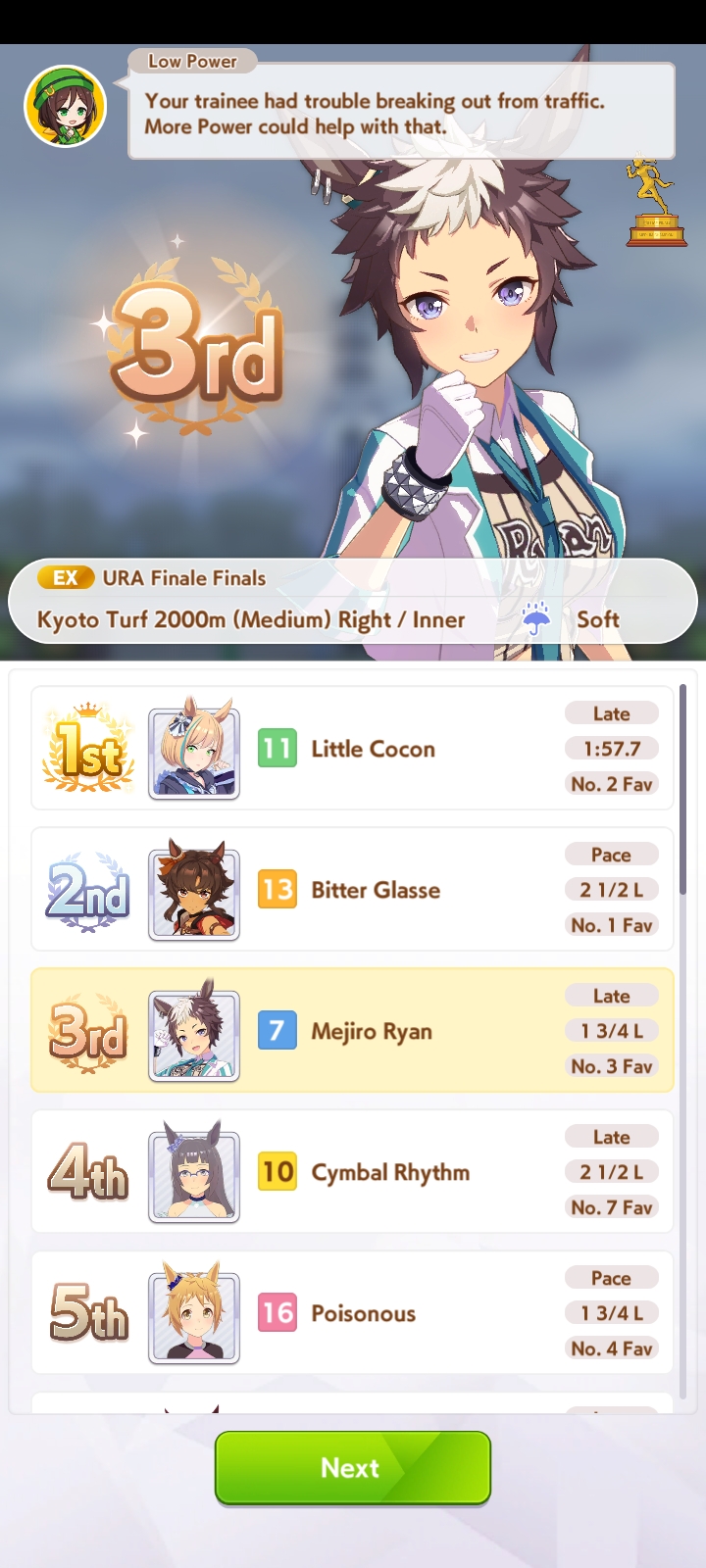 >>5931508 Если ты Урару взялся качать, то так и должно быть у неё в конце карьеры скриптовая гонка Арима где она будет проёбывать со своими статами всегда потому что это не её дистанция и покрытие. Почему? Потому что тренер мудак разрабы так решили. В целом это ни на что особо не влияет. Разве что есть челлендж выигать за неё эту Ариму, но пока что кроме китов это мало кому удавалось, на сколько мне известно. Ей вообще на траву противопоказано ходить ищи только Dirt трассы и желательно не длиннее спринта-мили.
