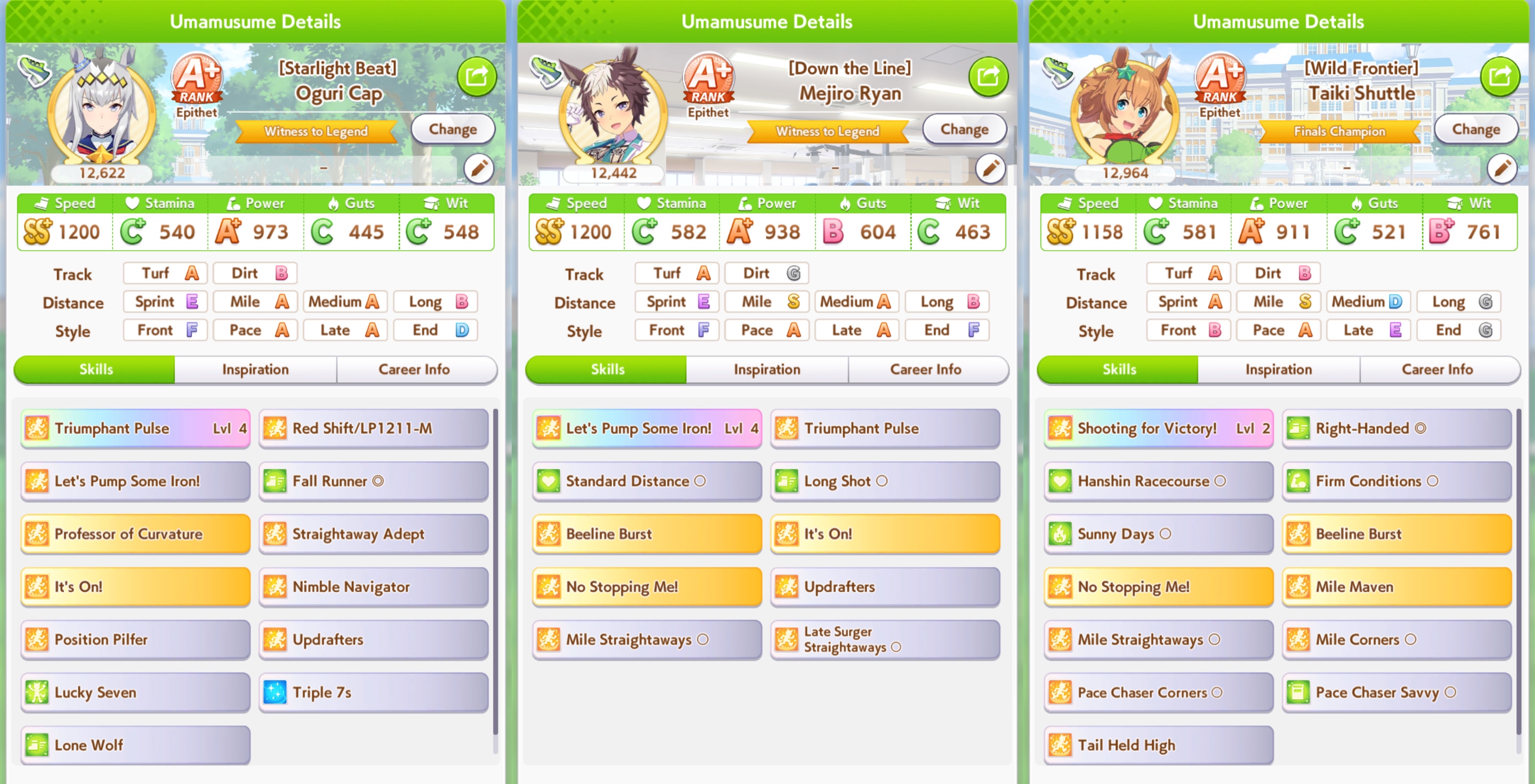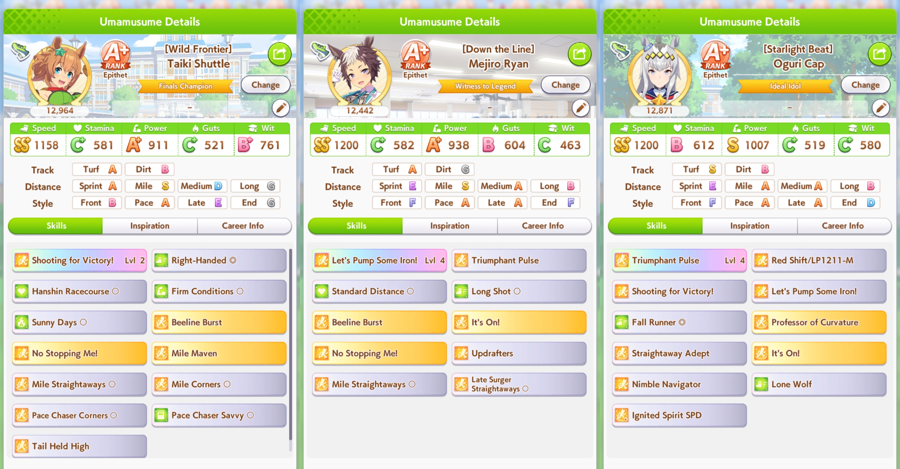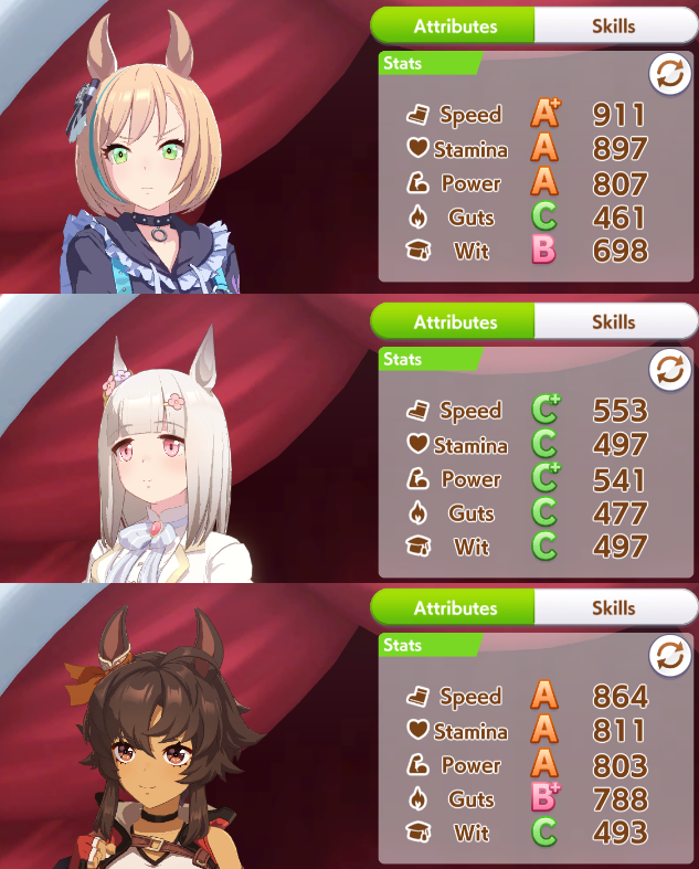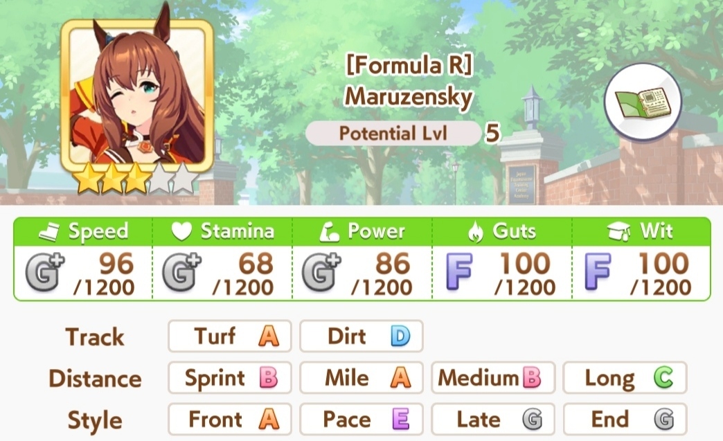 >>5927275 Ну с такими картами ты все равно сток не вкачаешь, но да +- так Еще зависит от трассы и твоего стиля бега. Но всегда чем больше спида, тем лучше, стамина на средне-длинных дистанциях важна (на милю можно 600), пава важна только на спринте и миле, ее надо от 850, вит нужен везде от 500 и от 800 если ты фронт, на длинный лонг можно даже не упираться в кап спида, а брать кап стамины и золотых рекавери. Гатс даже с бафом все равно самый последний стат, который надо качать, хватит и 400 или можно собрать фулл гатс билд на 900+ если это спринт