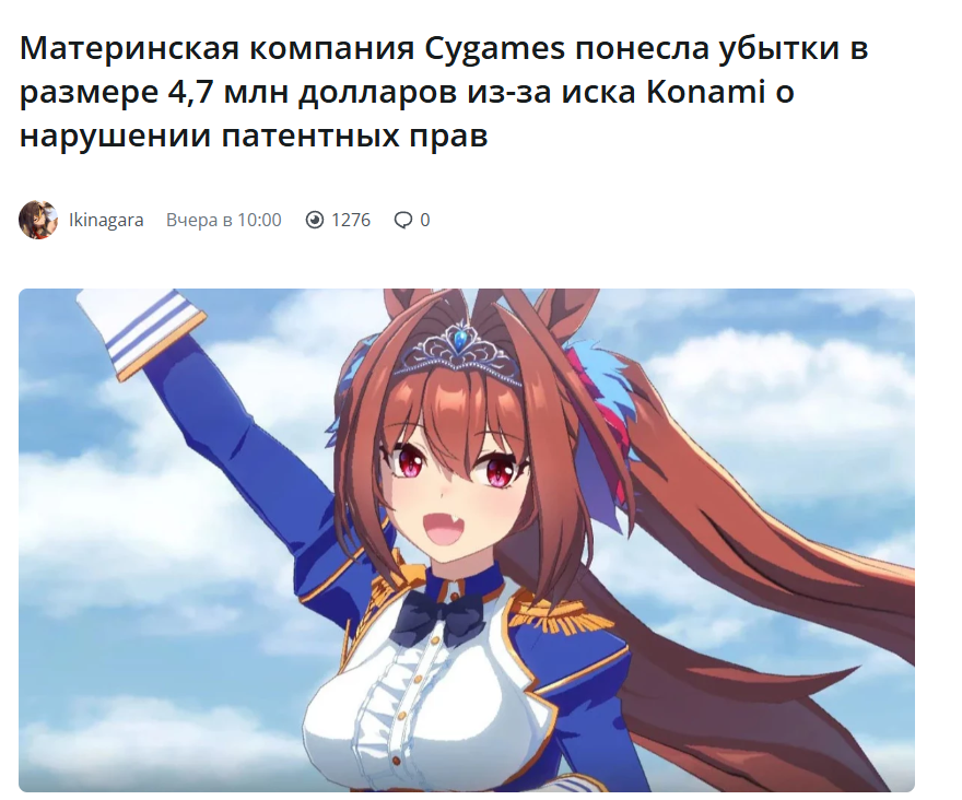 >>5913957 >Иск, поданный Konami в связи с предполагаемым нарушением нескольких игровых патентов в Umamusume: Pretty Derby, был подан в мае 2023 года и завершился 7 ноября 2025 года