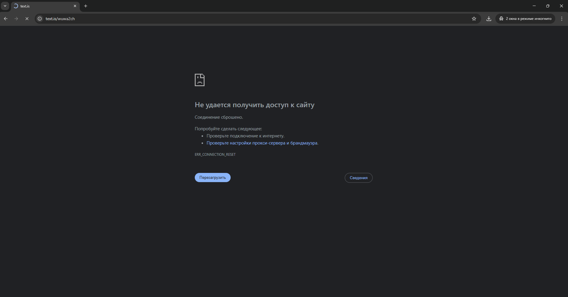 >>5873610 >>5873618 Я хз в чем проблема, ни инкогнито, ни другой браузер не помогли, просто бесконечная загрузка и ошибка Под тремя буквами ничего не меняется