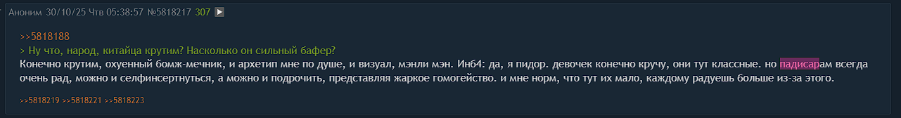 С кем в треде сижу. Про кожаные флейты гайды составляют и делятся опытом, слушают подкасты с Циюанем где его разговор про троганье мечей интерпретируют какой-то приватно, и фантазируют о заглатывании.