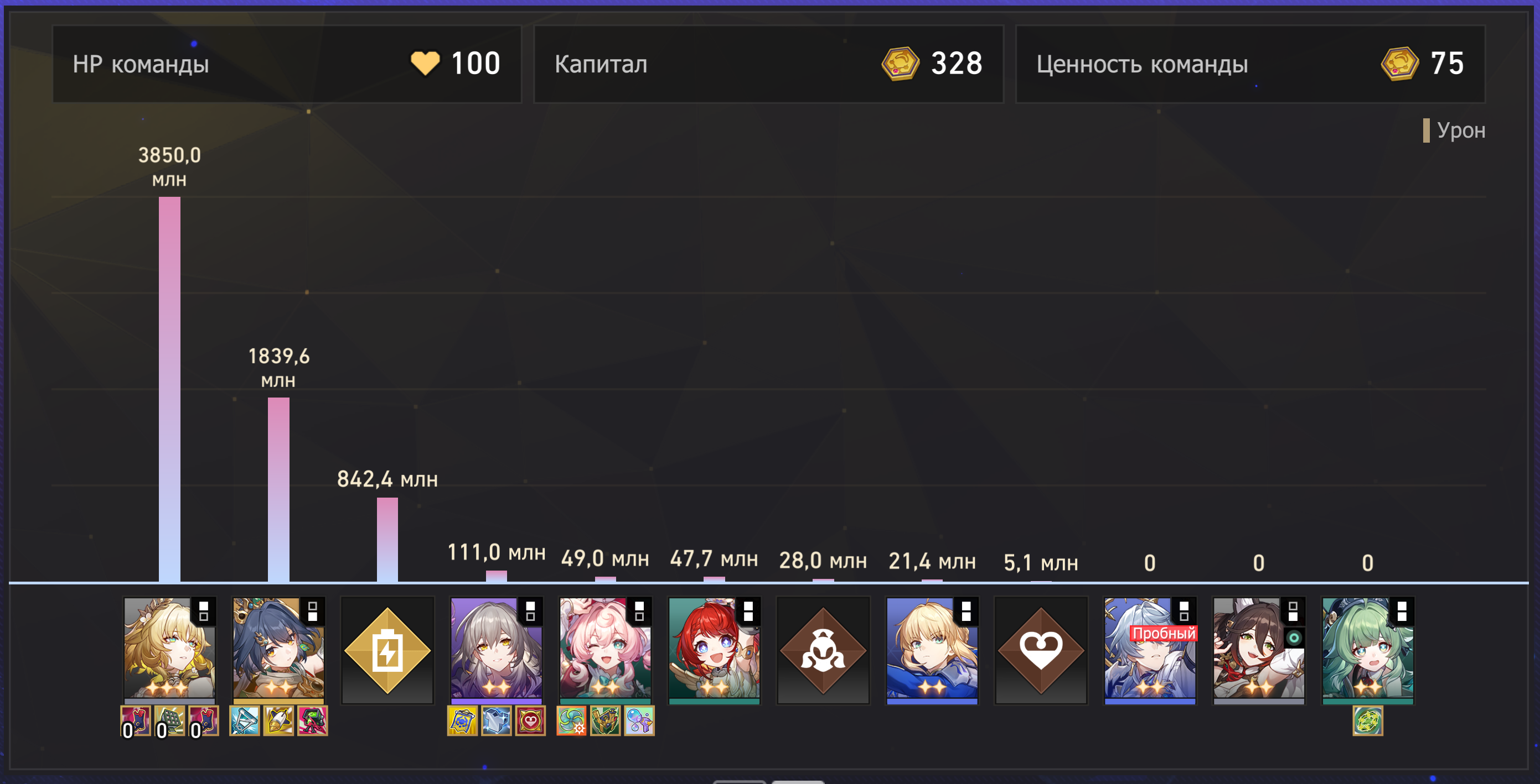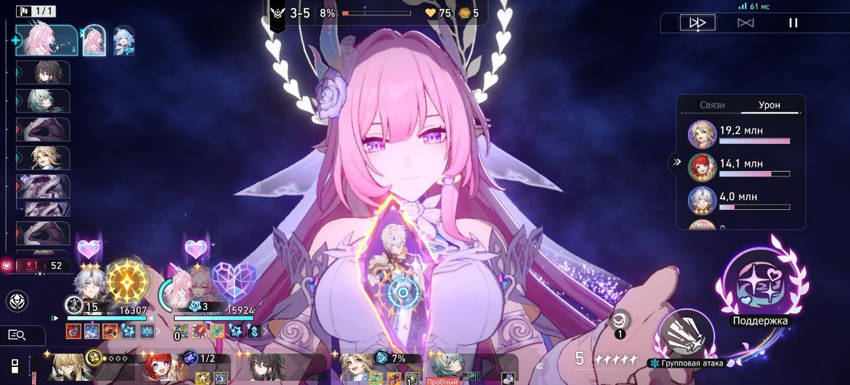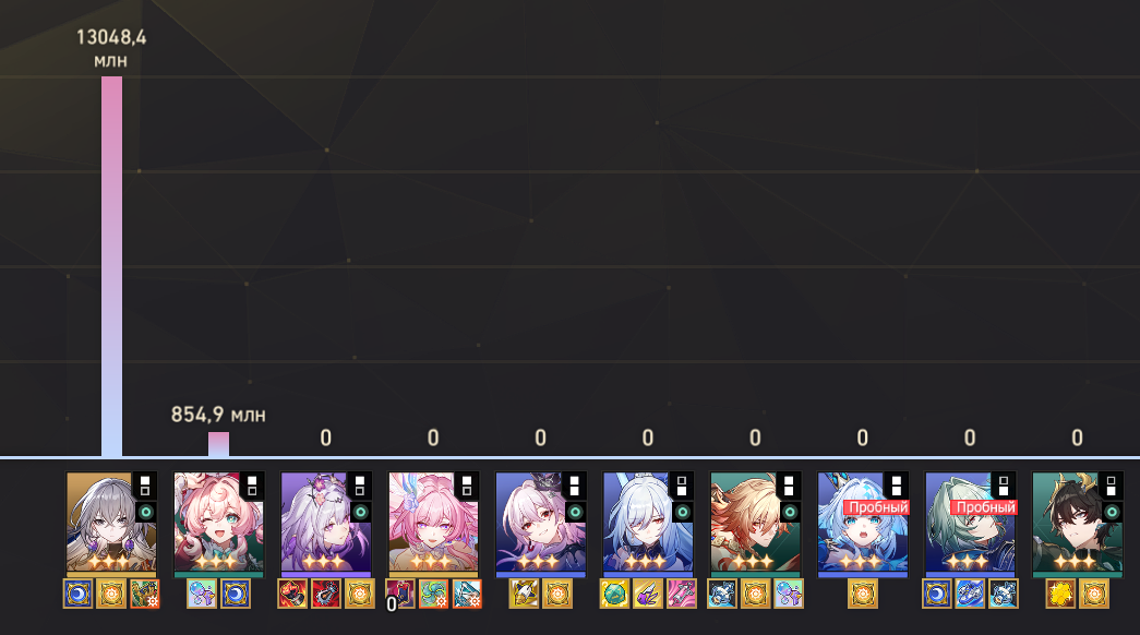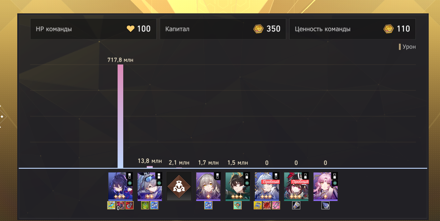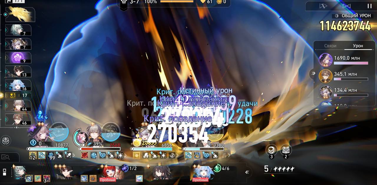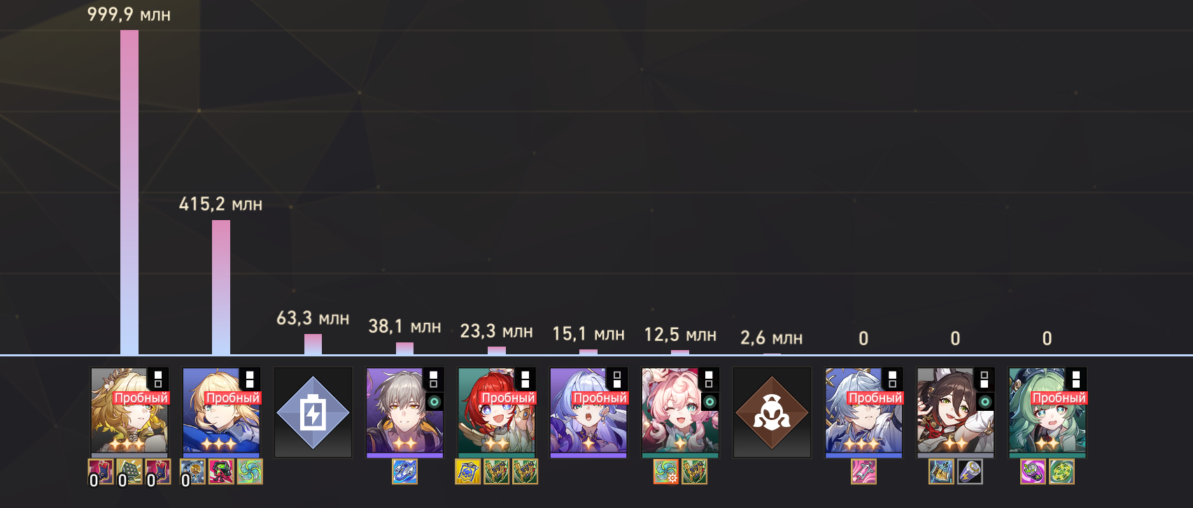 Брейк, ох, сложно описать отношение к нему, в начале это лютейший кал из-за того, что ебаная Раппа не дамажит нихуя, мне ещё выпал аффикс на короткие обычные битвы, она буквально 1 раз ходит, ей не хватает с её хода на ульту и бой заканчивается без единого её ульта. Проебал хп 50-60 из-за этого. Ещё и Фуга долго не приходила. Потом поймал Химеко 3стар. Короче, забейте хуй на нормальных брейк керри кроме Светки. Химеко 3 стар, ебёт просто пиздец, и она у меня в крит сборке под продвигу. Из-за чего скейл только игровой. Под 3е измерение хп пулы просто пиздец, едва успеваешь. Но после 2 стар светки со шмотками на ультимейты и с Волком. Это прям пушка, там каждый ульт по сотням миллионов уроны и даже миллиарды под настак всякого.