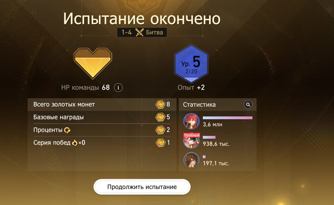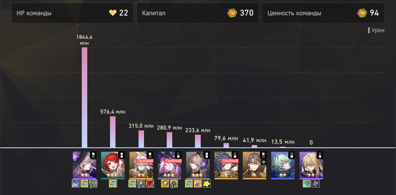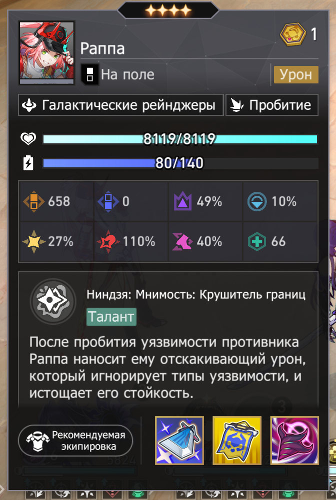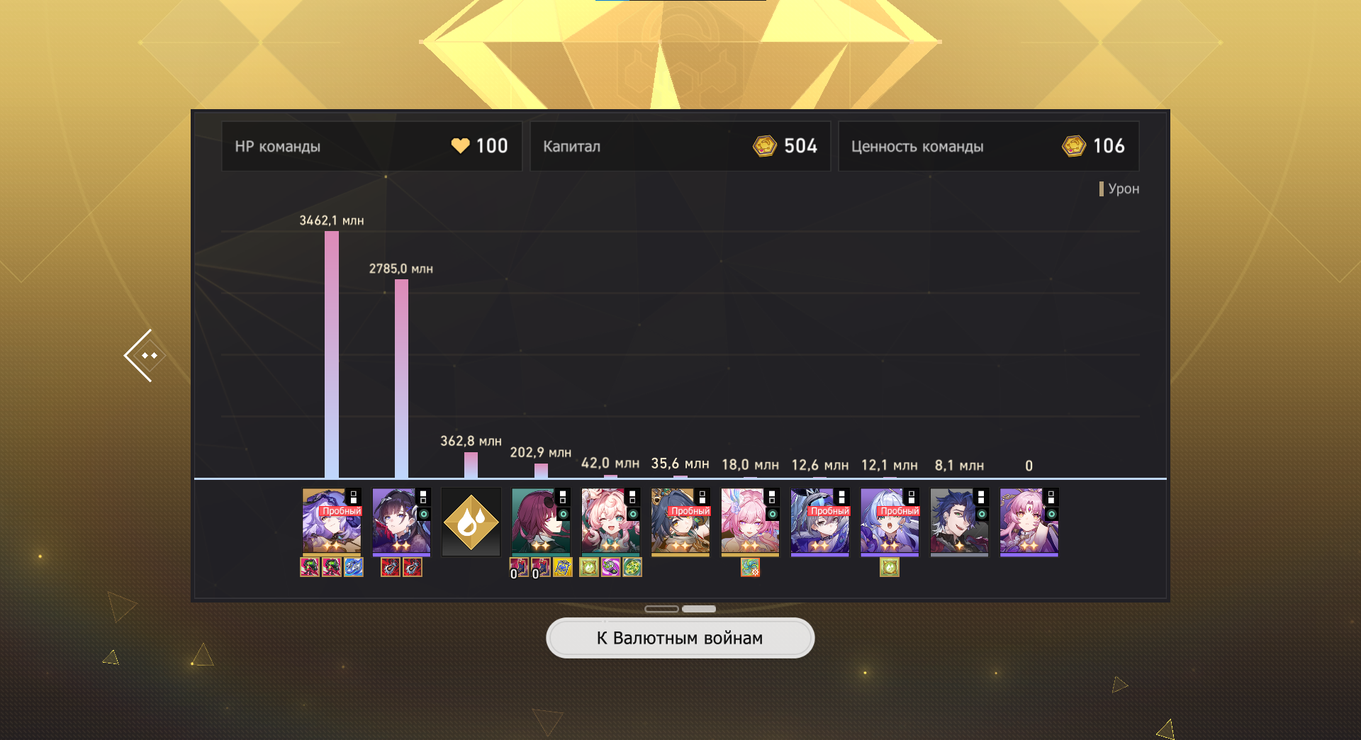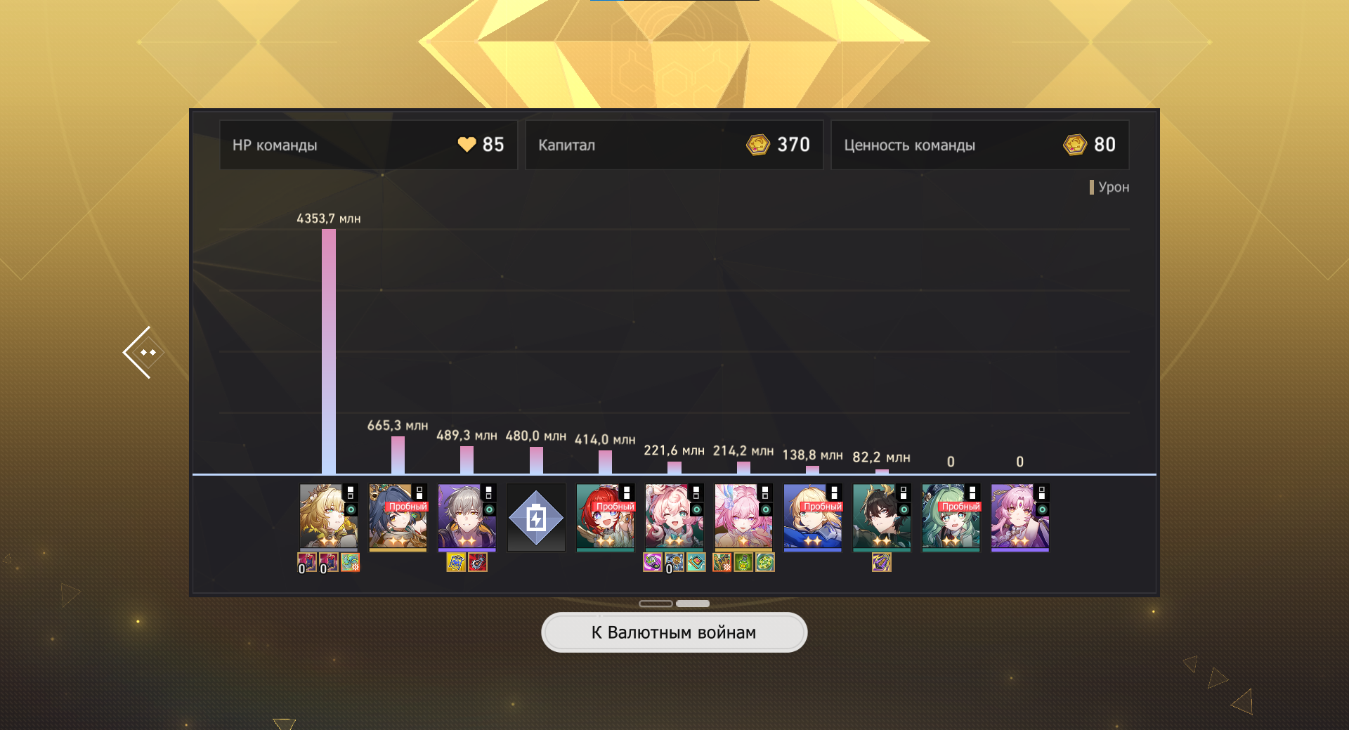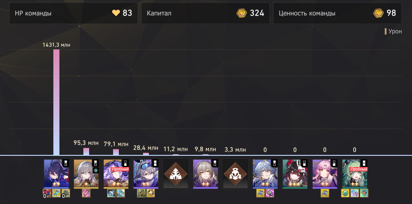 Брейк, ох, сложно описать отношение к нему, в начале это лютейший кал из-за того, что ебаная Раппа не дамажит нихуя, мне ещё выпал аффикс на короткие обычные битвы, она буквально 1 раз ходит, ей не хватает с её хода на ульту и бой заканчивается без единого её ульта. Проебал хп 50-60 из-за этого. Ещё и Фуга долго не приходила. Потом поймал Химеко 3стар. Короче, забейте хуй на нормальных брейк керри кроме Светки. Химеко 3 стар, ебёт просто пиздец, и она у меня в крит сборке под продвигу. Из-за чего скейл только игровой. Под 3е измерение хп пулы просто пиздец, едва успеваешь. Но после 2 стар светки со шмотками на ультимейты и с Волком. Это прям пушка, там каждый ульт по сотням миллионов уроны и даже миллиарды под настак всякого.