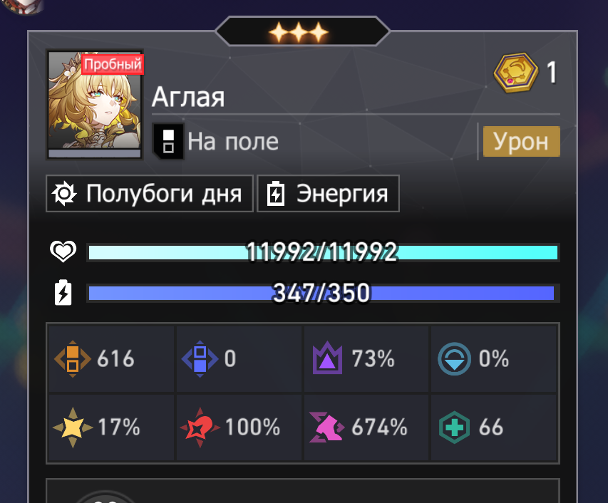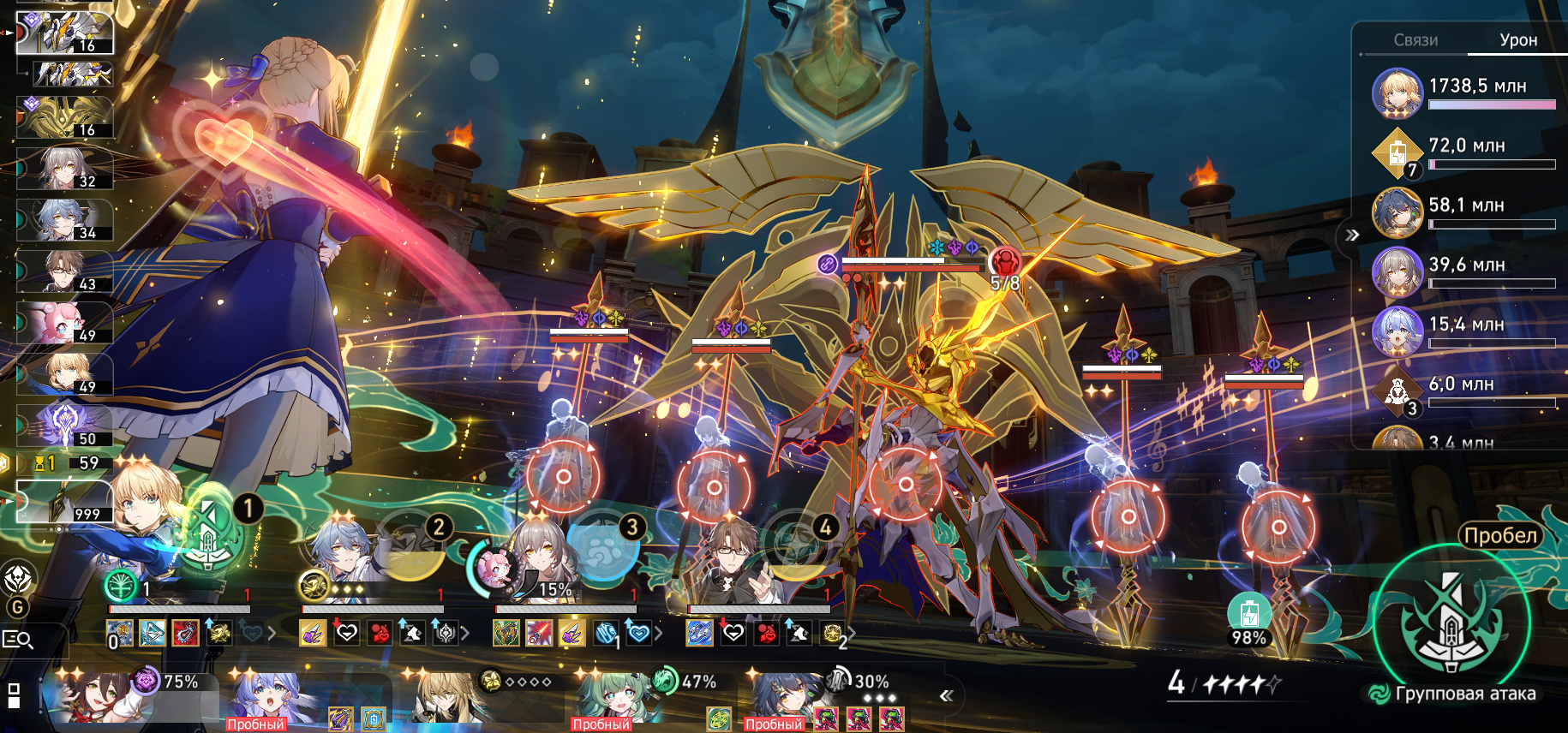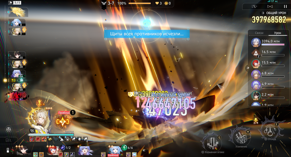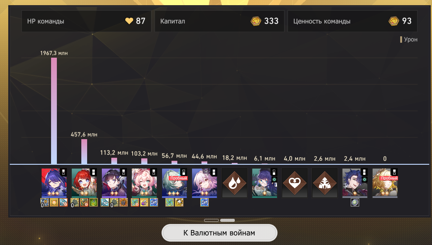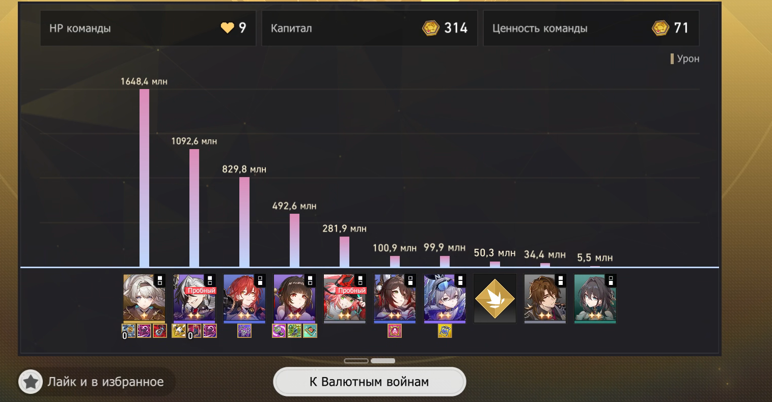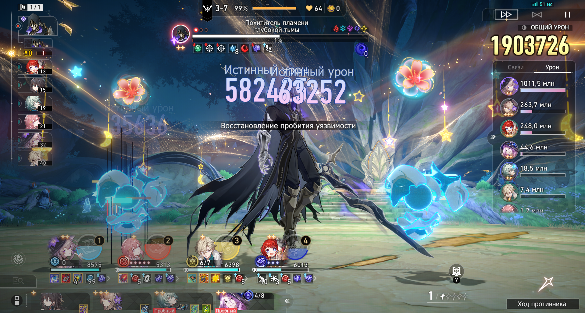 Брейк, ох, сложно описать отношение к нему, в начале это лютейший кал из-за того, что ебаная Раппа не дамажит нихуя, мне ещё выпал аффикс на короткие обычные битвы, она буквально 1 раз ходит, ей не хватает с её хода на ульту и бой заканчивается без единого её ульта. Проебал хп 50-60 из-за этого. Ещё и Фуга долго не приходила. Потом поймал Химеко 3стар. Короче, забейте хуй на нормальных брейк керри кроме Светки. Химеко 3 стар, ебёт просто пиздец, и она у меня в крит сборке под продвигу. Из-за чего скейл только игровой. Под 3е измерение хп пулы просто пиздец, едва успеваешь. Но после 2 стар светки со шмотками на ультимейты и с Волком. Это прям пушка, там каждый ульт по сотням миллионов уроны и даже миллиарды под настак всякого.