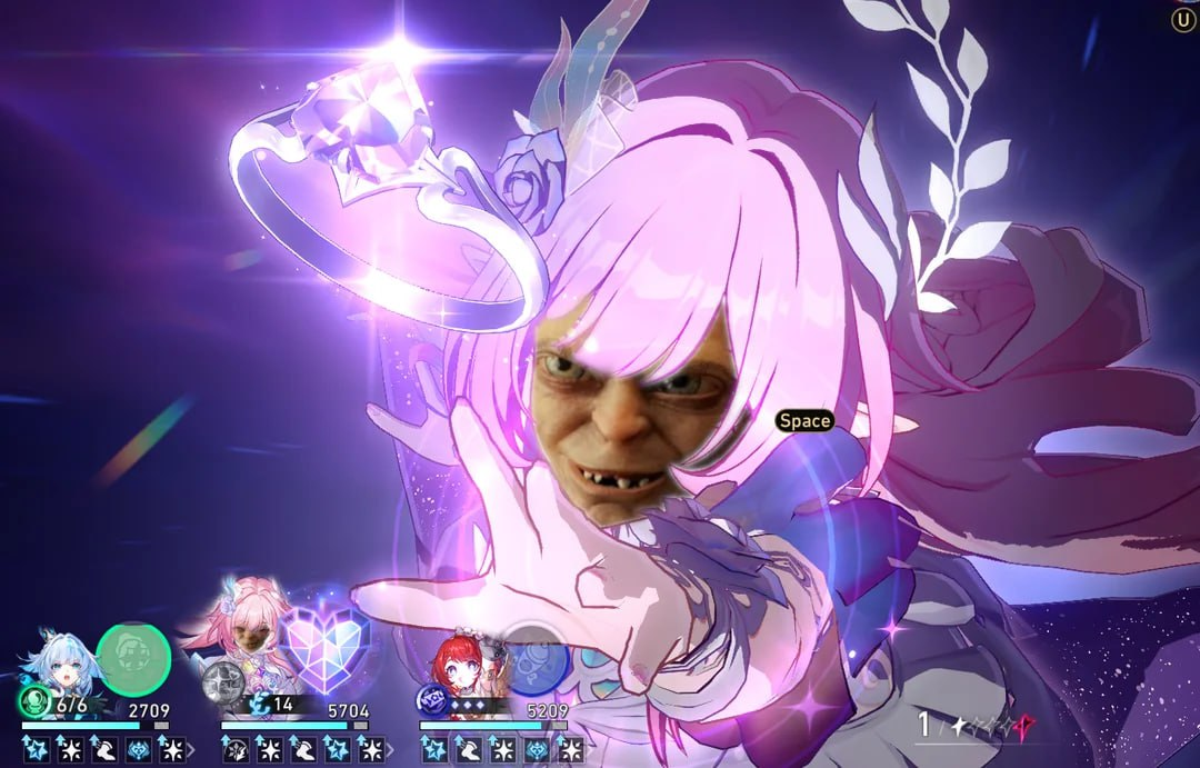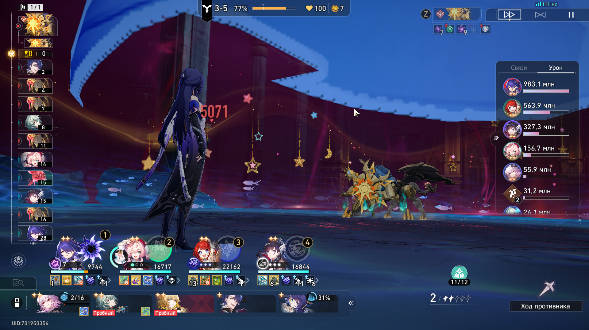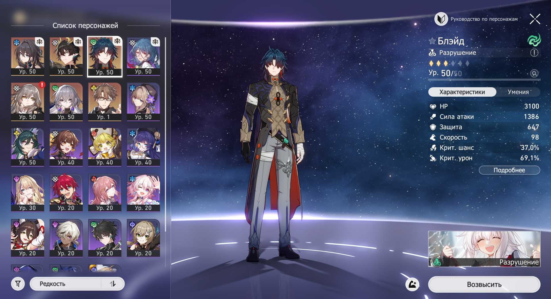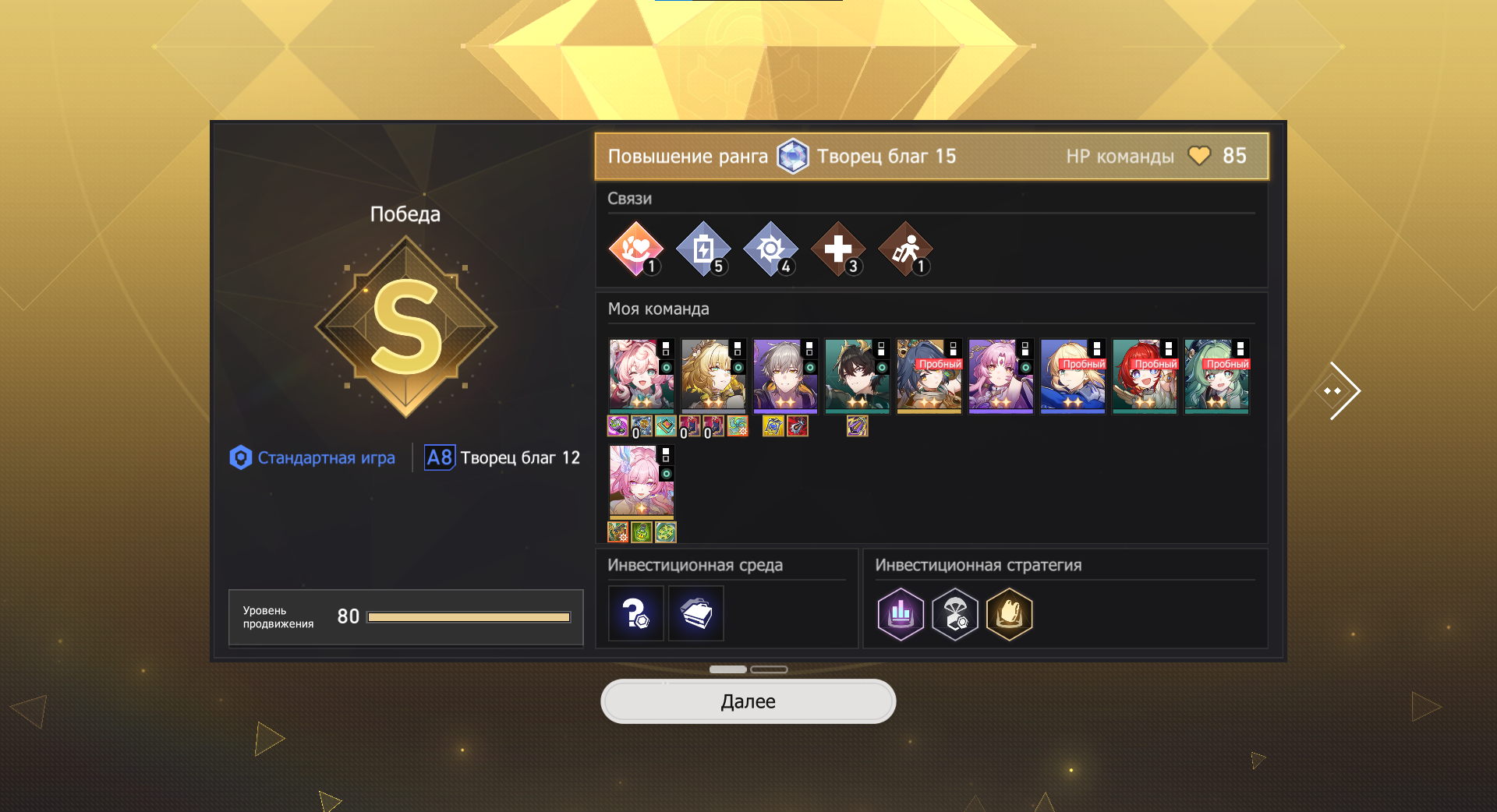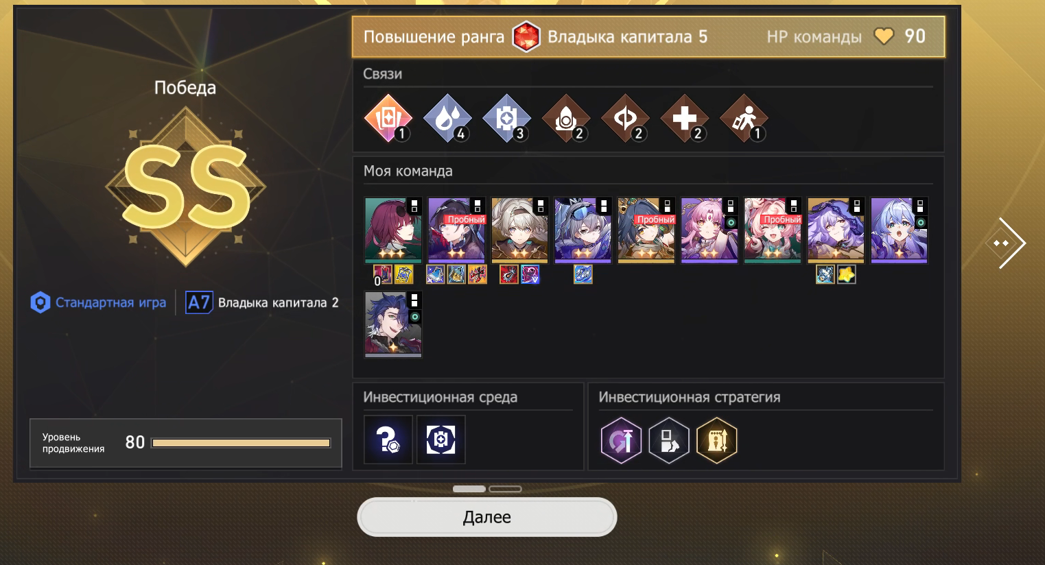 Брейк, ох, сложно описать отношение к нему, в начале это лютейший кал из-за того, что ебаная Раппа не дамажит нихуя, мне ещё выпал аффикс на короткие обычные битвы, она буквально 1 раз ходит, ей не хватает с её хода на ульту и бой заканчивается без единого её ульта. Проебал хп 50-60 из-за этого. Ещё и Фуга долго не приходила. Потом поймал Химеко 3стар. Короче, забейте хуй на нормальных брейк керри кроме Светки. Химеко 3 стар, ебёт просто пиздец, и она у меня в крит сборке под продвигу. Из-за чего скейл только игровой. Под 3е измерение хп пулы просто пиздец, едва успеваешь. Но после 2 стар светки со шмотками на ультимейты и с Волком. Это прям пушка, там каждый ульт по сотням миллионов уроны и даже миллиарды под настак всякого.