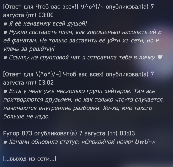 >>5879054 Удалила аккаунты и при любом случае подтрунивает над этим, словно гордится величайшим достижением. Но при этом уже сейчас зависима от помощи Волчика.