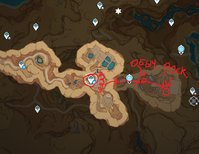 >>5882591 Там где вот эта вот херня на поверхности, под ней есть подземная лока, которая по доп.квесту открывается с Сорушей. Вот если у тебя есть эта подземная точка ТП, идёшь к стрелочкам (Тем, где спиральку нарисовал - обозначил длинный спуск вниз через шахту лифта.) потом выходишь по подземелью в какой-то зал перед огромными воротами, ну там и будут сундуки.