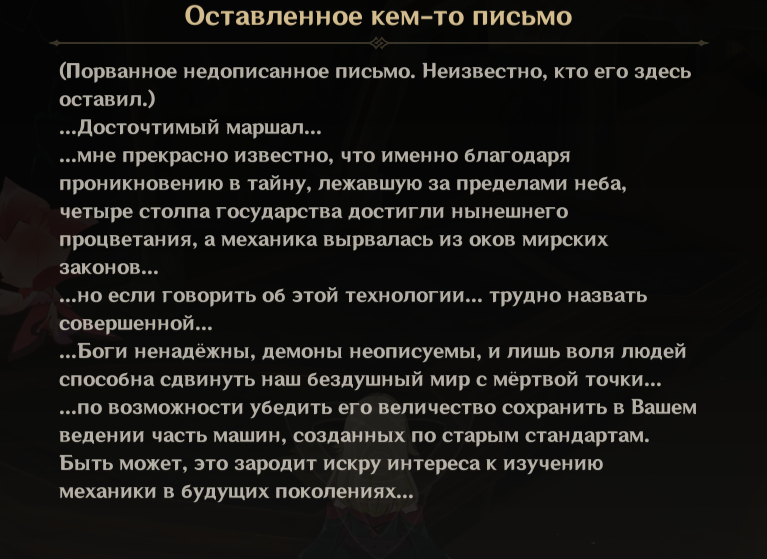 Из этих двух записок я понял две вещи. Первое - Каэнрию ёбнули не за технологию и скорее всего даже не из-за прорыва Бездны, которую они расковыряли. А только лишь из-за дырки в небе. Второе - всех персонажей Геншина при случаи можно обелить... практически всех, кроме одного - Роновы. Даже Рейндоттир можно обелить, сказав, что её эксперименты с гончими и Дуриным просто вышли из под контроля, а Дотторе вообще мученик, продвигает науку во благо, жертвуя меньшим или что-то вроде. В общем обелить всех можно, но не Ронову. Сука просто взяла и прокляла на хиличурлизацию вообще ВСЕХ мимококов, целое блять королевство обрекла на ужасное бытие монстром, которые даже не причастны к тому, что там верхушка делала. А вот как раз таки эту самую элиту она "обрекла" на страшное существование бессмертным, ну ахуеть.