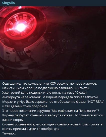 Ощущение, что коммьюнити ХСР абсолютно необучаемое. Или слишком хорошо подвержено влиянию Энигматы. Уже третий день подряд читаю посты на тему "Сюжет Амфореуса не закончен". И Кирена передала сигнал азбукой Морзе, и у Нус было зеркальное отображение фразы "NOT REAL" и так далее и тому подобное. Это новое поколение верунов "Мы ещё спим на Пенаконии"? Кирену разбудят, конечно, и вернут в сюжет. Но случится это ой как не скоро. Сильно сомневаюсь, что сегодня появится новый пласт сюжета (шизы пришли к дате 12 ноября, да). Тяжело...