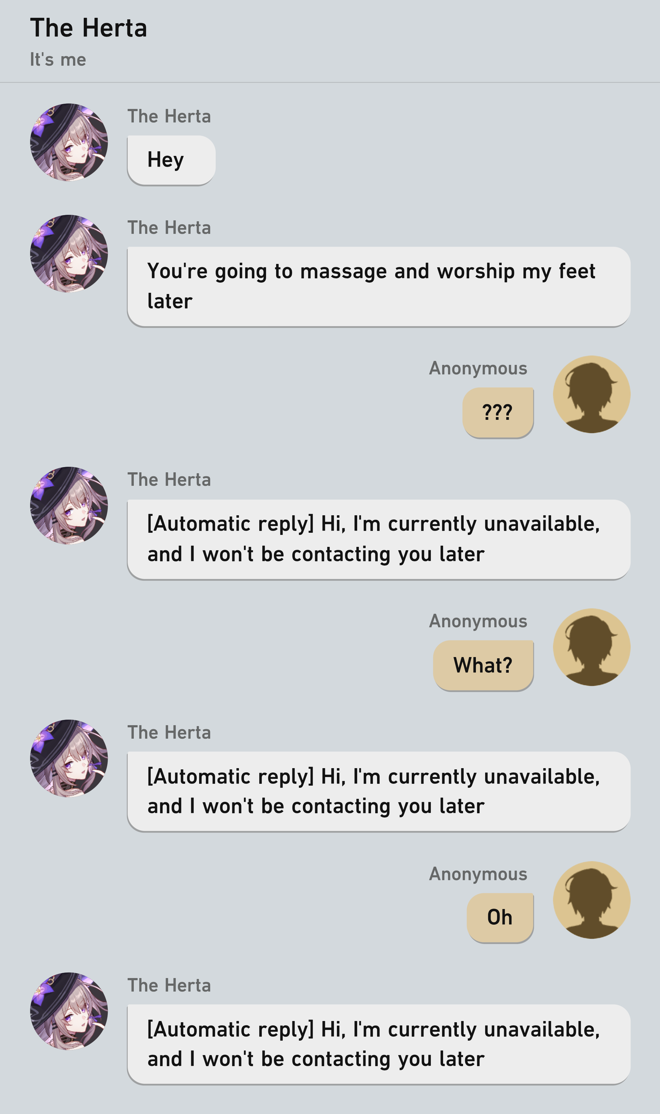 Лучше веди себя в нашей сети, Иначе тебе лучше уйти! Удачу сольет тебе ее секундант! В жизнь не получишь заветный свой кант! С Гертой Великой ты не шути! Ей не проблема тебя низвести!