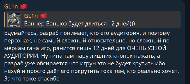 Вдумайтесь, разраб понимает, кто его аудитория, и поэтому персонаж, не самый сложный относительно, но сложный по меркам гача игр, ранится лишь 12 дней для ОЧЕНЬ УЗКОЙ АУДИТОРИИ. Ну типа там пару лишних кнопок нажать, а разраб уже обсирается что игрун это не будет крутить ибо нехуй и просто даёт его покрутить тока тем, кто реально хочет. За что тоже спасибо