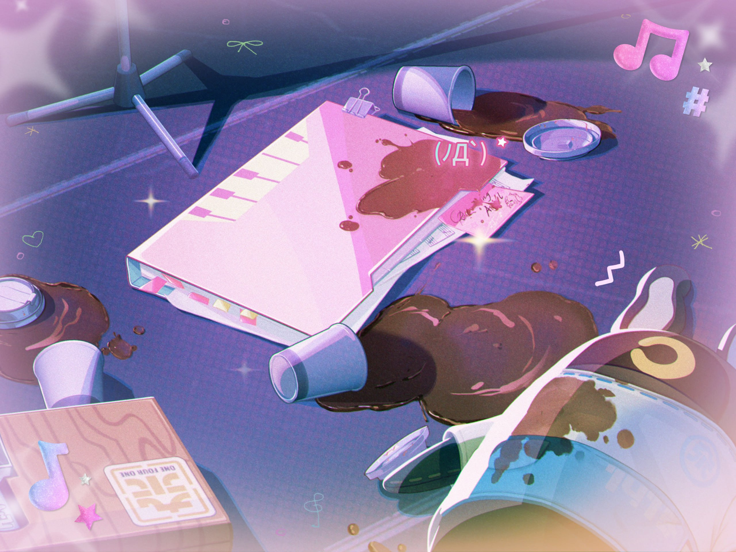 Первый день, когда я помог за кулисами в 404 Live, и они попросили меня помочь переместить какое-то оборудование... я закончил тем, что столкнулся с доставкой Bangboo! Аааа... кофе закончился повсюду на нотах (ω ω;)
