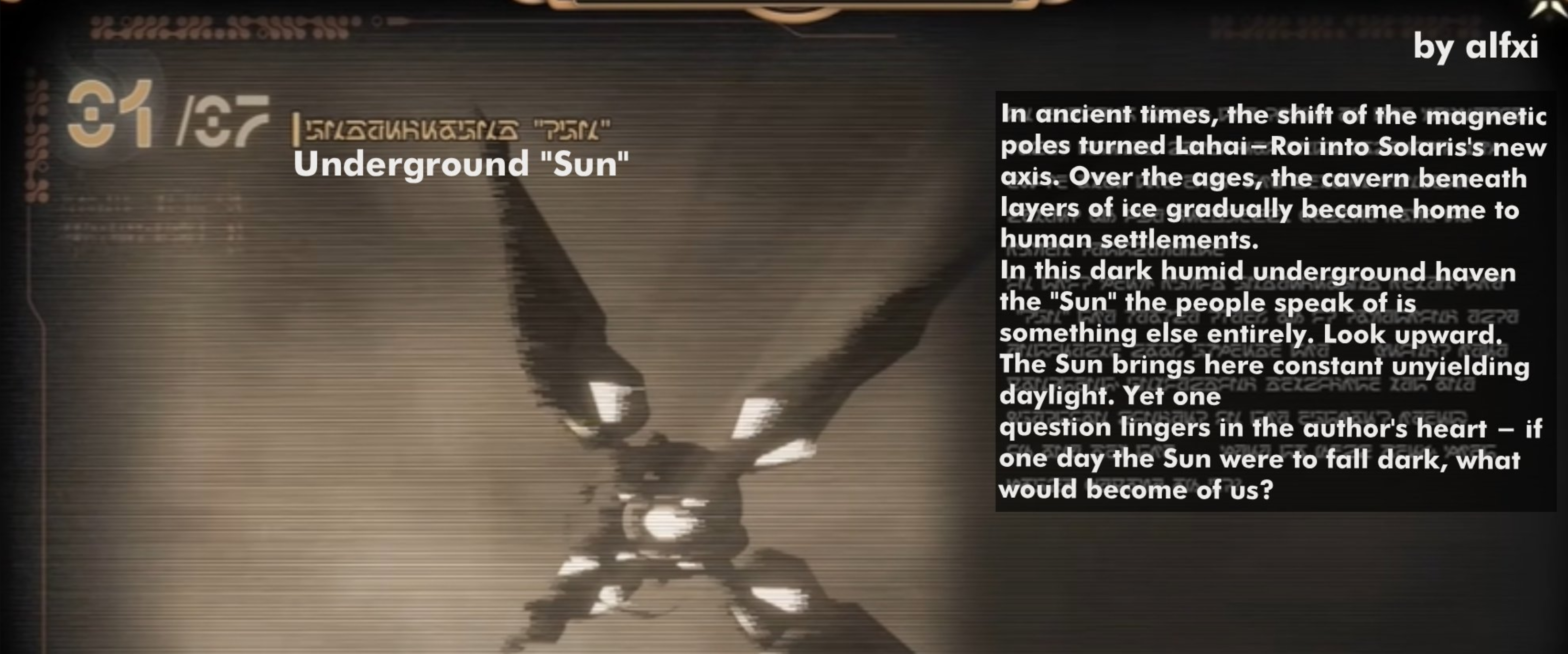 В древние времена сдвиг магнитных полюсов превратил Лахай-Рой в новую ось Соляриса. На протяжении веков пещера под слоями льда постепенно становилась домом для человеческих поселений. В этом темном влажном подземном убежище "Солнце", о котором говорят люди, это нечто совершенно иное. Посмотрите вверх. Солнце приносит сюда постоянный, непреклонный дневной свет. И все же один вопрос не покидает сердце автора если однажды Солнце померкнет, что станет с нами?