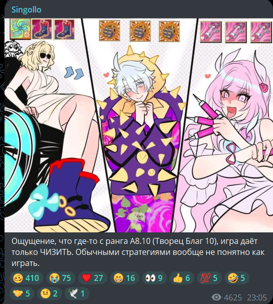 В этой связи, картинка адресована вопрошающему выше. Тут лучше не задерживаться, а вот игру поиграть стоит, и найти другое комьюнити/друзей. Качество в ней скачет, но в целом тенденция что чем дальше тем лучше. И она даже в четверть не настолько заебная как геншин с зюзей.