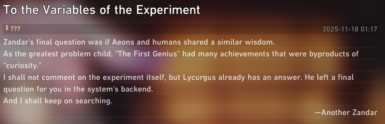 Нехило у вас там закрученные сюжеты, оказывается, про бесконечность, большой взрыв, первичный бульон, зарождение, ролики со спецэффектами проработаны, всякие аллюзии на хаос и греческие мифологии, текста много. Даже удивлён, неужели вы всё это читаете и понимаете, реально столько событий в голове держать. Даже самому поиграть захотелось, но две гачи уже не вытяну. Но накручено знатно.