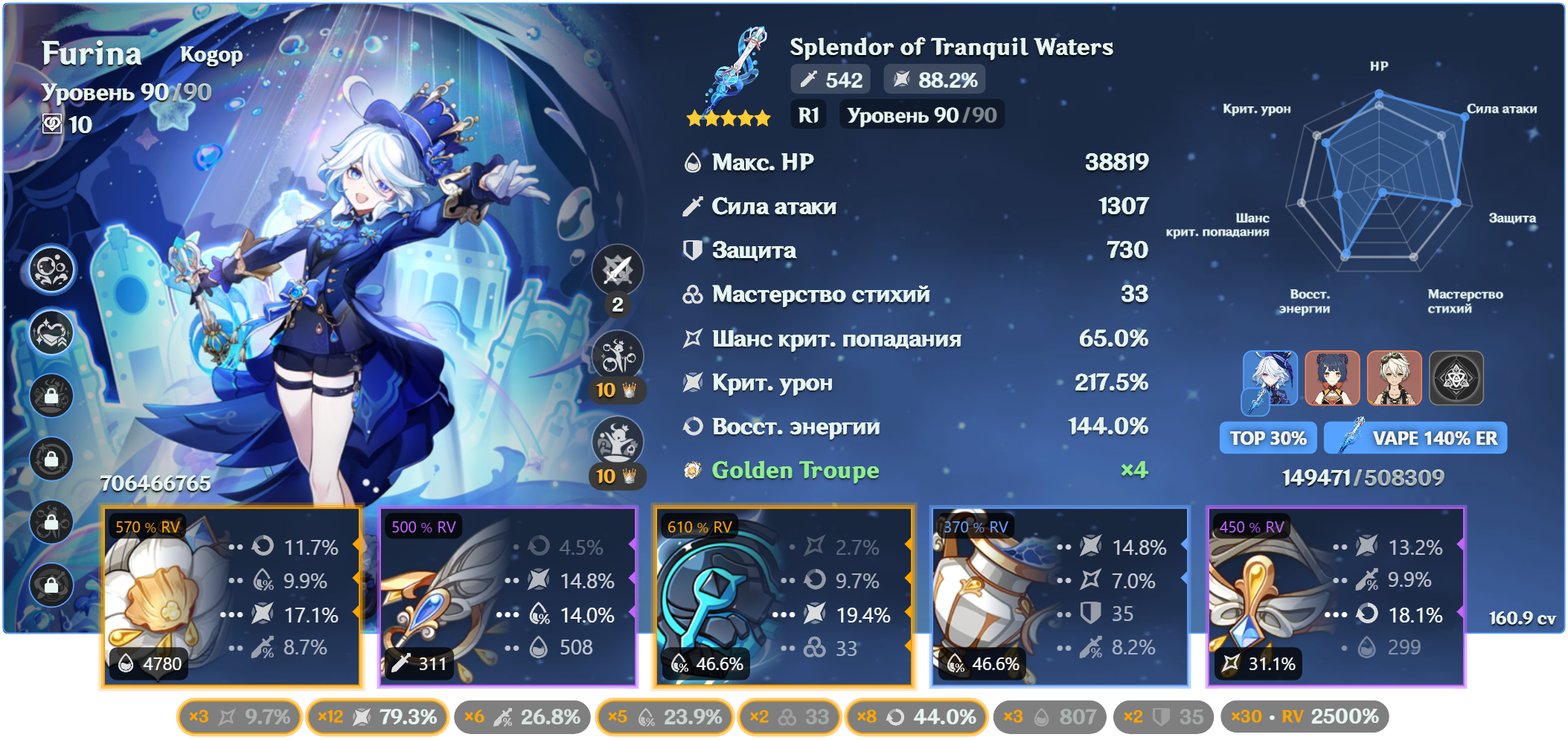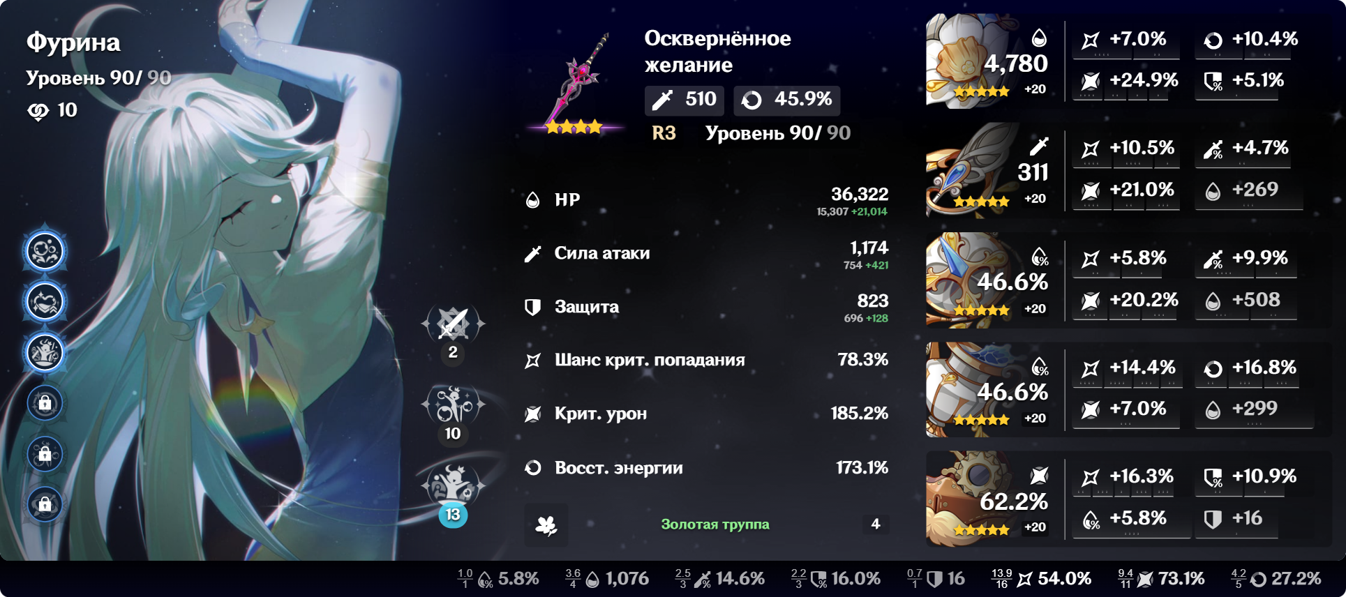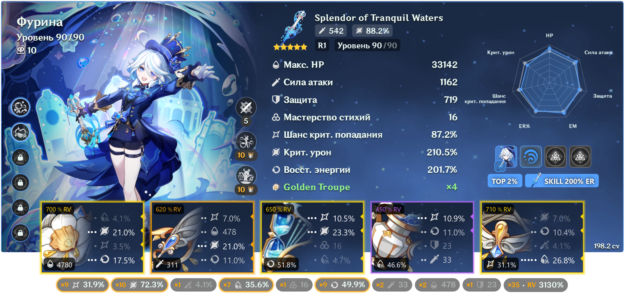 Показываю минимум какой должна быть Фуриночка.сейчас бегаю ЛаньЯньШило эскофье фурина.Да это не уровень идти натик 4-5,но всех боссов они закрывают попеновских.