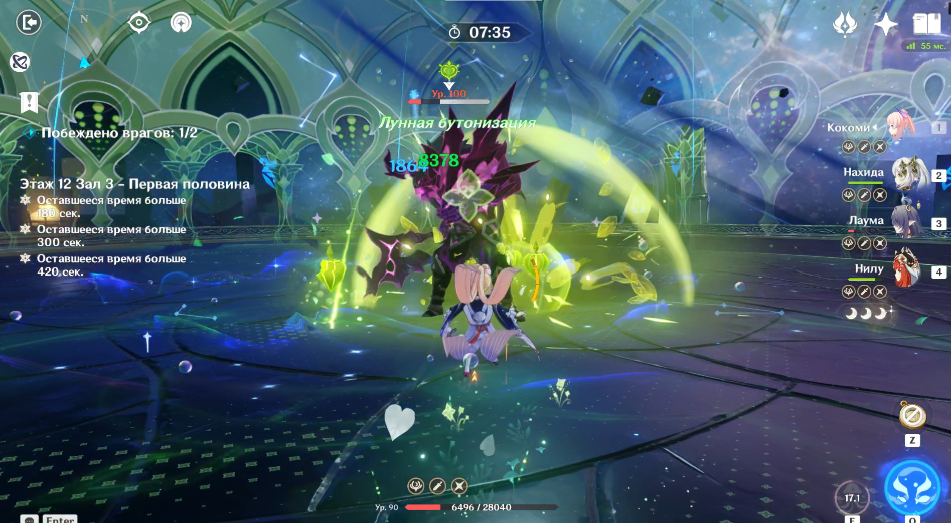 Играл нилу наверху и гипердыню внизу - сложность почувствовал. На коне раза три обосрался дав коню впитать в себя дендро и во второй половине райден несколько раз откисла на петухе и бубоне, в сумме получилось около шести рестартов.
