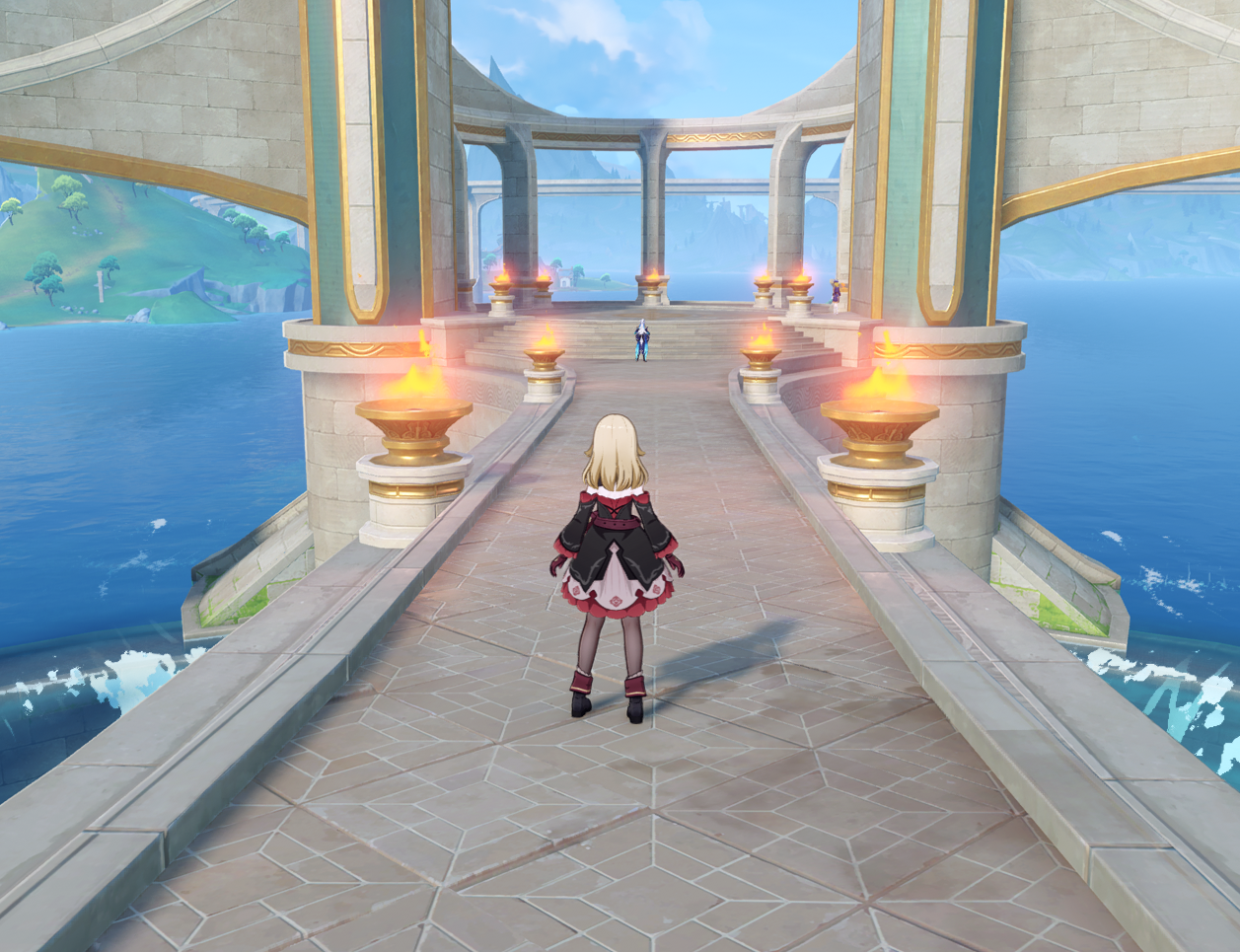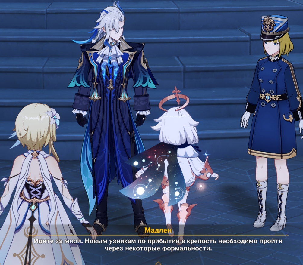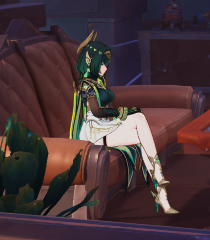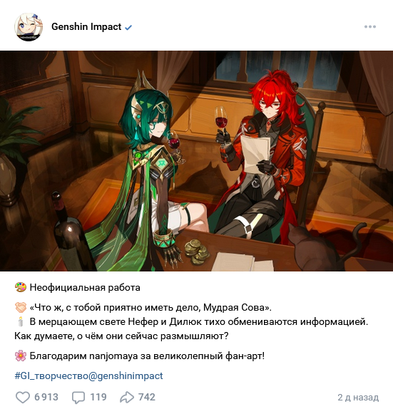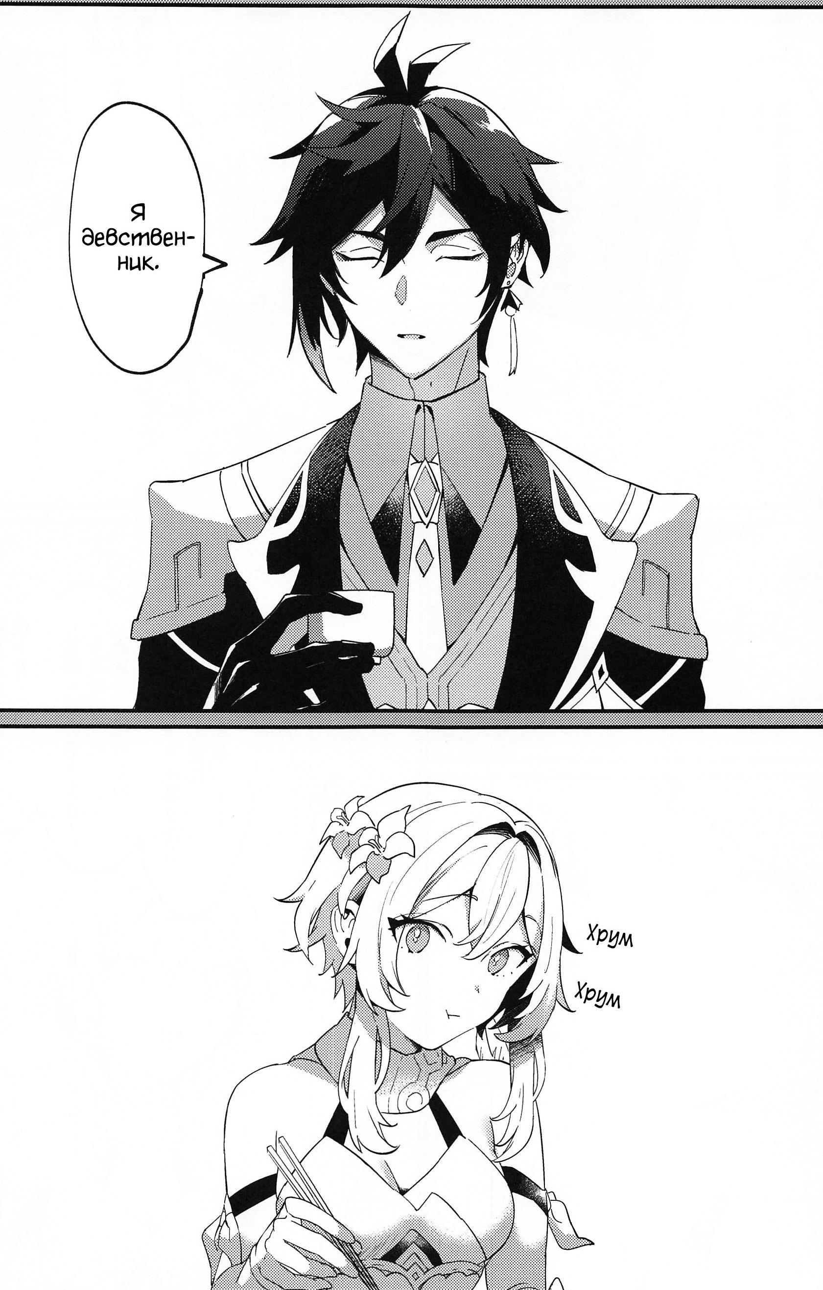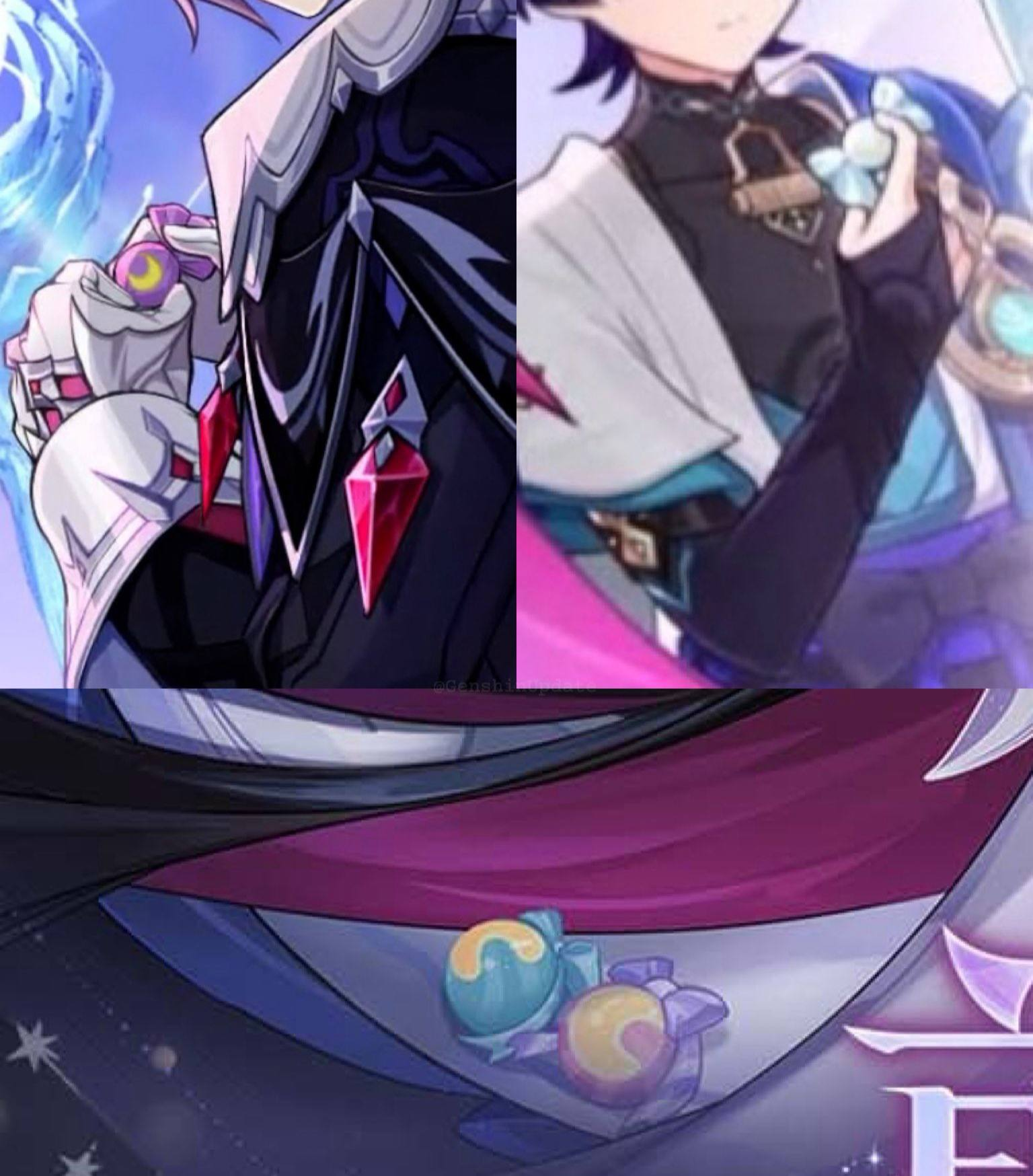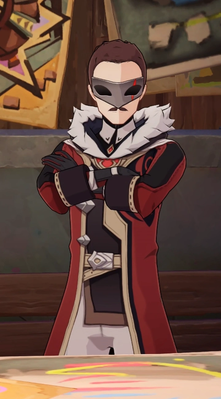 Комната в резиденции Фатуи. Сдержанный, почти стерильный интерьер. За небольшим столом сидят Сандроне и Колумбина. Перед ними — изысканный фарфоровый чайный сервиз. Сандроне с холодной, аналитической точностью поправляет свою чашку. Колумбина смотрит в окно на ночное небо, ее лицо озарено безмятежной, мечтательной улыбкой.