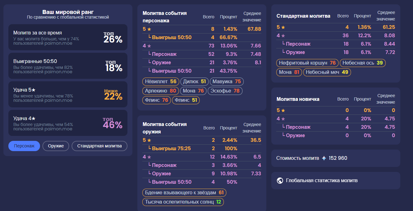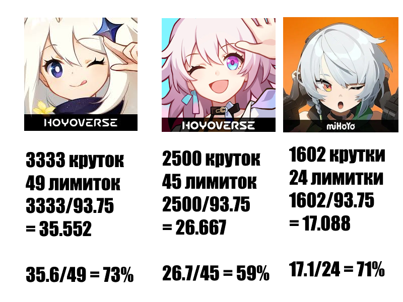 могу чуть-чуть ошибаться, т.к. на хср и ззз вики нормально не пишут, сколько в игре лимиток, надо считать самому и вычитать стандартных опущены всякие мелочи, такие как кэшбек круток (должен где-то на 10% увеличивать число круток) и пленительное сияние (которое среднее число круток на лимитку снизило где-то с 93.75 до 90-92)