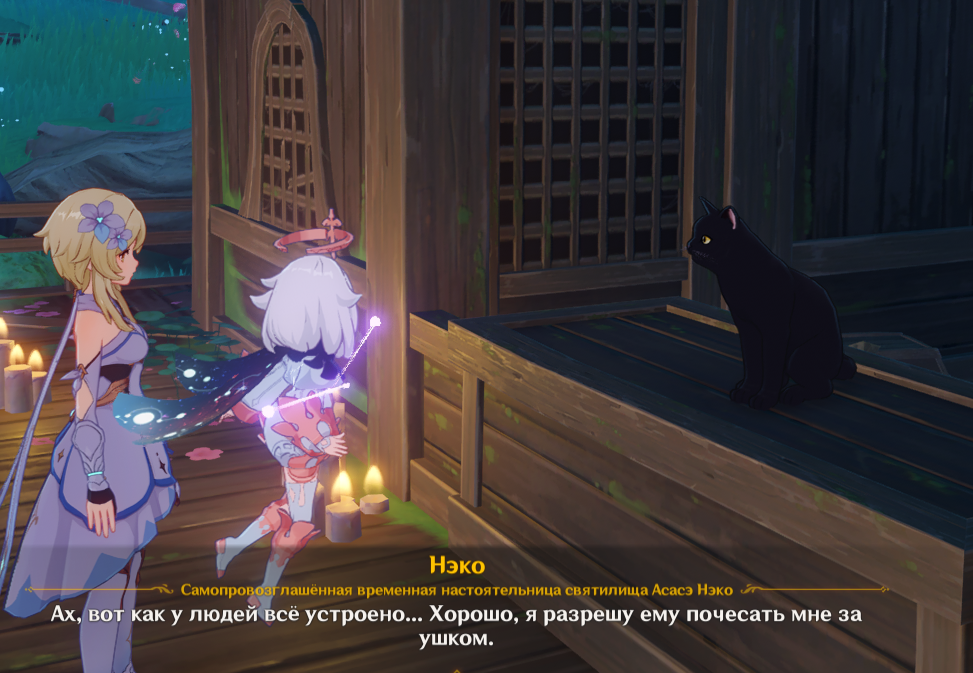 А так она мелькала только в двух ивентах на моей памяти. В Симуланке, когда под конец приходила вместе с остальными чемпами из Монда. Ну и в ивенте, где нужно было котика гладить, она там тоже была... Там ещё Оза выгнали из кошачьей таверны, потому что он всех котов там наэлектризовывал и у них шёрстка дыбилась.