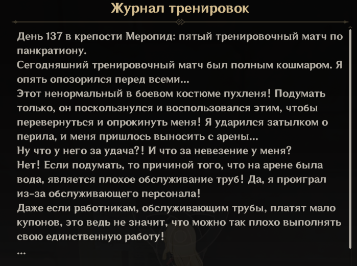 Не знаю, для кого делались загадки в Меропиде - но явно для каких-то надмозгов. Я уже час это колесо кручу и только две двери из четырёх открыть смог. Алсо, но ладно бы там хотя бы что-то было. В первой двери просто записка, а во второй вот эта боксёрская груша типа Герман. И я реально ожидал тут какой-то секретки. Я бил этого Германа стихиями как в записке, потом подумал, что нужно её 999 раз ударить как в той же записке и будет секретная секретка... сука, у меня запястье устало кликать ЛКМ тысячу раз, но я это сделал. И что я получил? Да ничего, просто впустую время потратил.