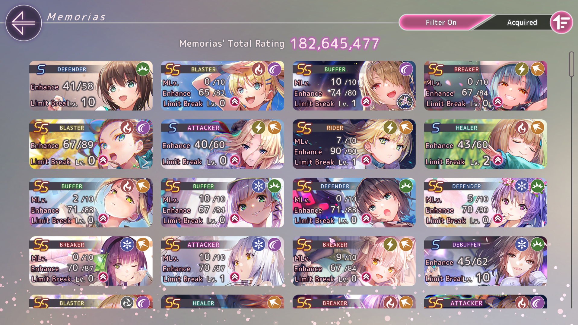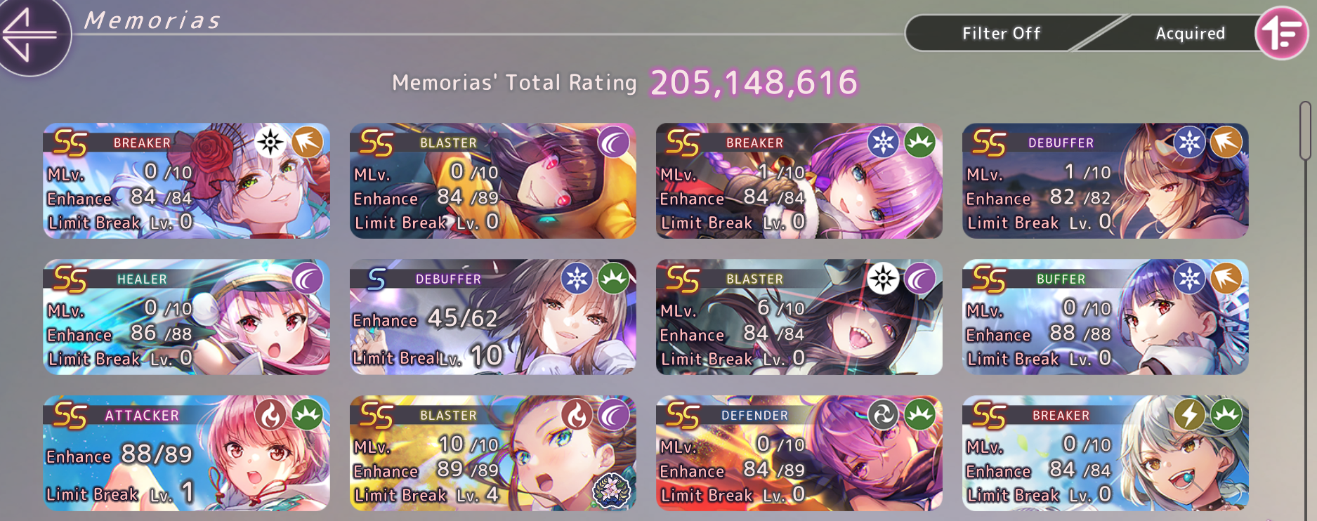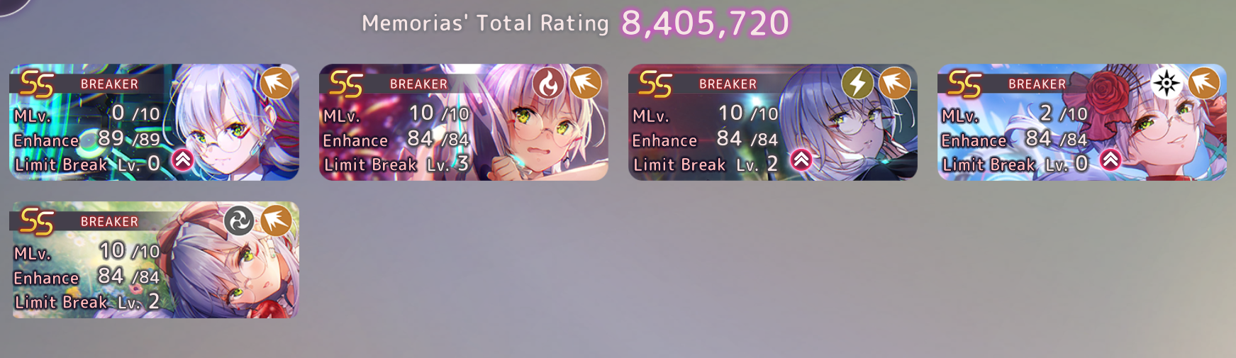 Максимальный отрядный уровень экипированных аксессуаров составляет 401 (все обычные мементо, кольца и чармы качества +4, серьги и браслеты качества +6). Если одеть девочке мементо с полной заточкой, то оно даст на 2 уровня выше обычного. Таким образом кап левела бирюлек на глобале сейчас составляет 413 единиц.