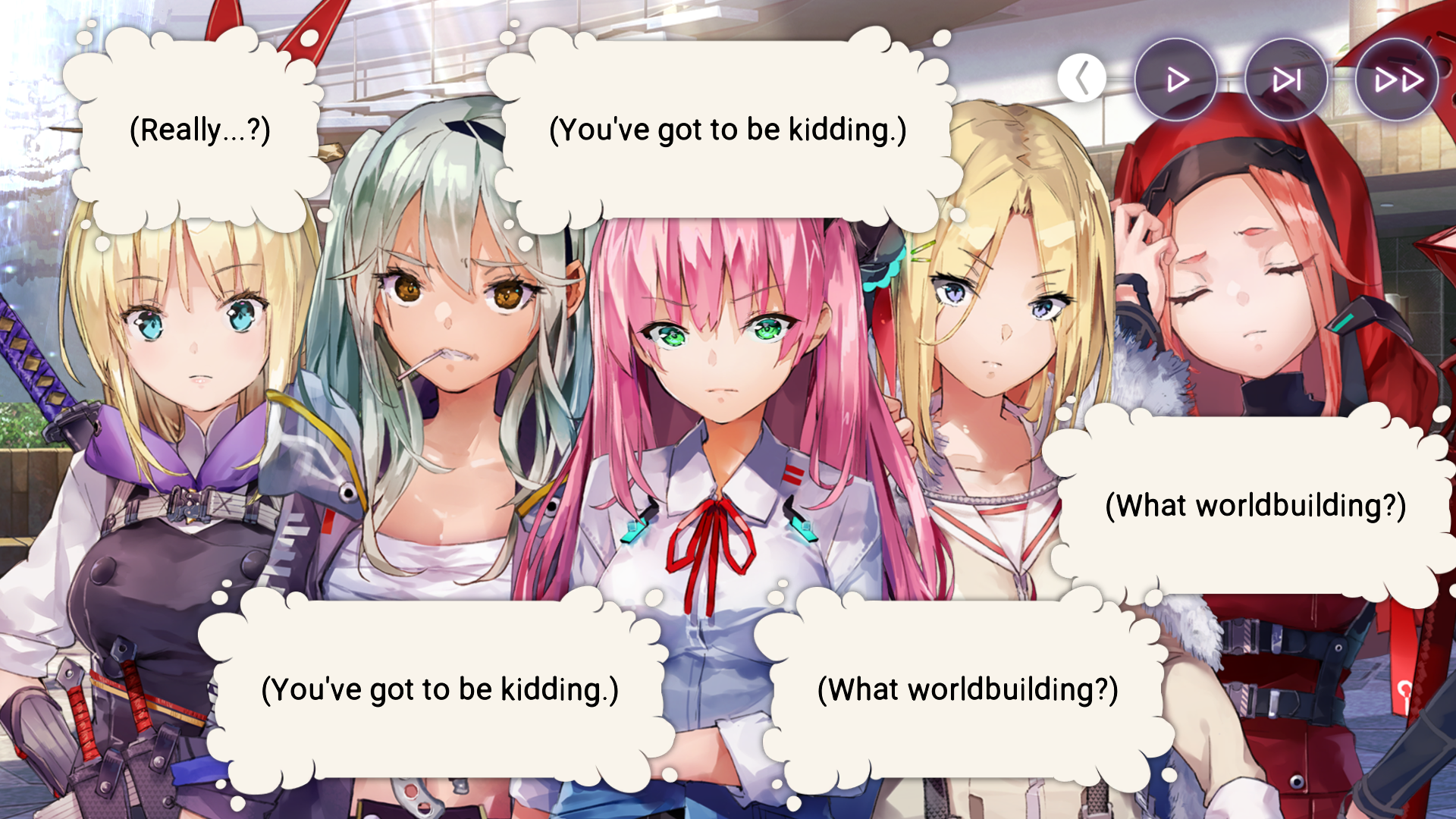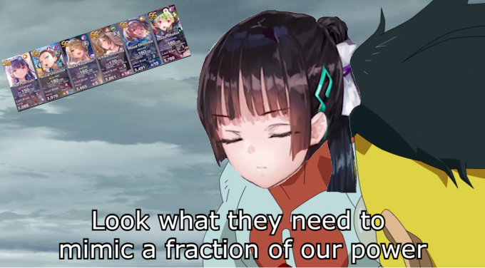 Мне надо прекратить крутить баннеры отряда Руки, их слишком сильно распирает от мощи, читеры. Всему виной импульсивные крутки и лишняя удача, 1 унисон пережили осталось еще 2. А то сначала крутани этих и этих до лб4 а потом додепай на метовые SSRы, знаем мы эти уловки п2в ггшек игры. А Ошимы они всегда бедные, выходят раз в полгода, всегда тир3, всегда свои для ф2п бомжеанона. Не настолько как разрезающая до еоса воздух Инорин2 и все ее 4лбшки с шардов но тем не менее.