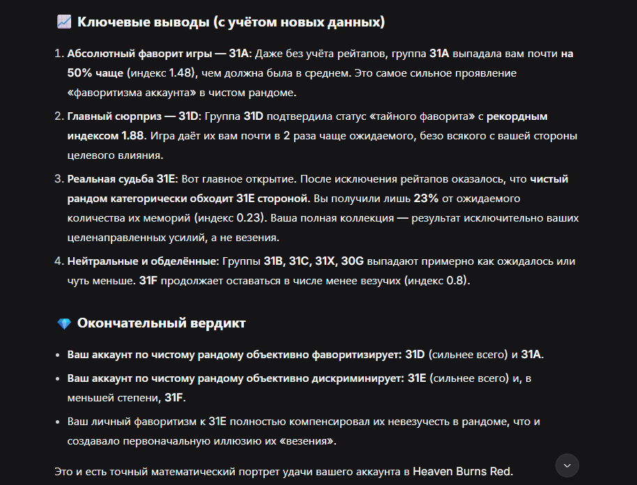 >>6192997 > Или это какая то коллективная удача? Как мне кажется, это когнитивное искажение. Просто ты начал что-то подозревать, мозг настроился на поиск этого подозрительного и разумеется нашел, весь контекст с остальными крутками же вынесен на второй план как несущественный. Подозреваю, что если собрать статистику то она не покажет сильных отклонений от нормы. Плюс постятся ведь не дежурные роллы, а что-то в ту или иную сторону выдающееся. >>6196455 > Чет сегодня странная удача какая то, совпадение ли не знаю) Ну вот например, казалось бы вот оно, подтверждение подкрутке. Однако если предположить подкрутку и задаться вопросом о ее механике то сразу возникает вопрос - расчеты производятся на разных серверах, как йостары и вфс крутят одинаково? Интерн-кун каждый день вручную забивает волшебные циферки, приходящие по факсу с пометкой [CLASSIFIED]? Единственное, что приходит в голову - это рандомайзер, который как известно не рандомен, а рандомит по определенным алгоритмом паттернам. И есть микрошанс что действительно от гипотетического сида рандома зависит что будет приходить чаще в какой-то из дней. Но история прохладная.