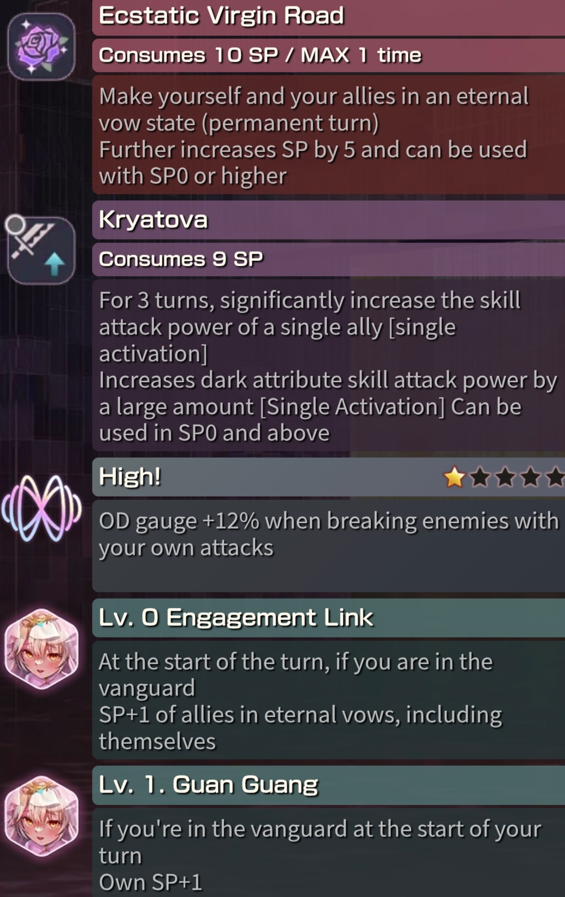 >>6010848 Дива это баф за 14 сп на 5 ходов вроде? Баф даёт вампиризм и усиливает 7сп баф фаннела Руки с 5х20% до 3х80%, 3 хода. Вроде так? С бафом дива пассивка на фронтлейн +2сп за ход. С лб1+ будет 5 сп в ход фронтлейнеру. Получается если есть кому заливать сп нужно это делать для Руки, чтобы быстрее в дива состояние выйти.