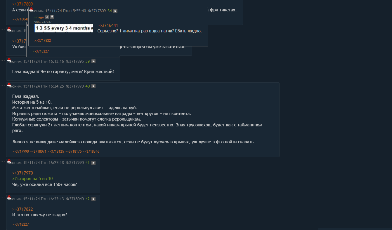 >>6192963 Ну, я отредактировал свою мысль в посте но дополню. Радужные пулы действительно могут быть скриптовыми дропами, они происходили пару раз на фри билетах в реролле, первыми крутками причем. Я мониторю когда постят сски и зачастую эти подгоны, как я заметил случаются у большинства в одни и те же дни. У меня примерно в то же время рандомные крутки начинают вспыхивать фиолетовым, после длительных окон неудач, это как таймлайн на удачные полосы. Или это какая то коллективная удача? >>6192963 >качать акк собрался? Да планировал, пока что буду заходить и собирать фрипулы за логин. Потом на буст кампаниях качнуть нормально и играть в СА. Ну или займусь им и протестирую сколько времени займет поднятие в гору для ньювжушки для закрытия регулярного контента, в спидран режиме, были же вопросики такие.