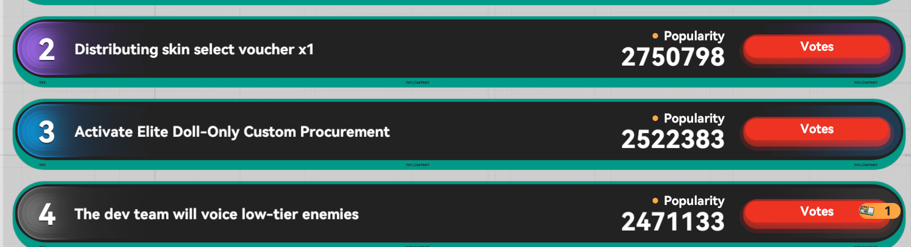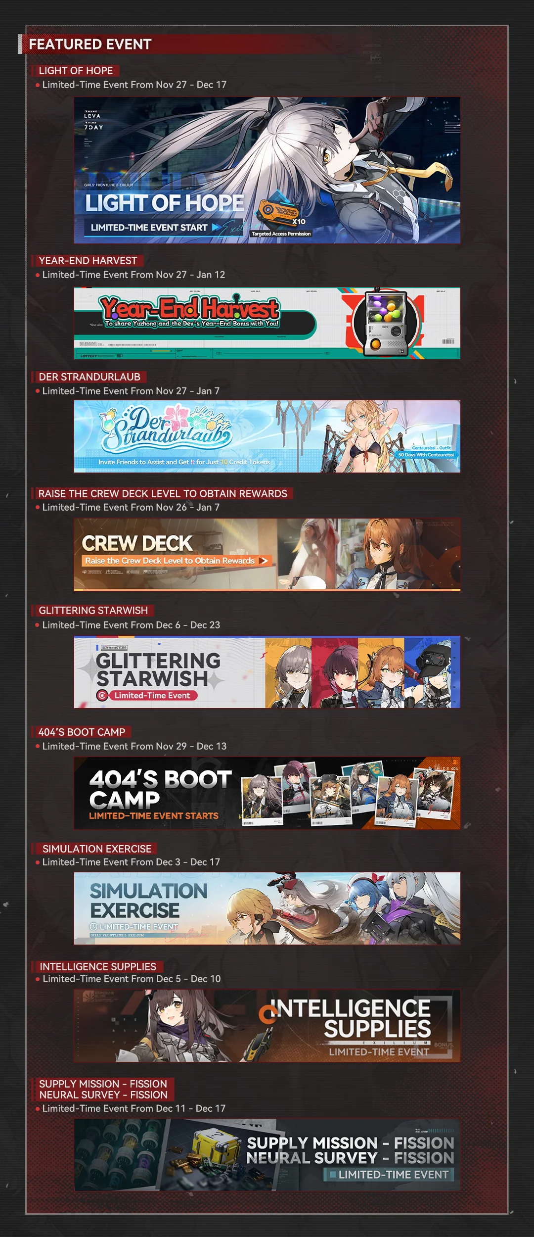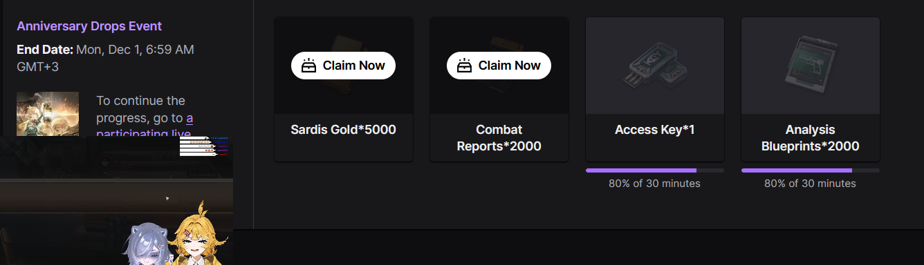 Нужно БОЛЬШЕ ивентов. Завтра в 8:00 по МСК начнутся дропсы на твиче. Крохи, но может кому надо. Работает только на ДВ, почему для Хао нету ХЗ. Все награды за 30 минут просмотра, 100 коллапсов падают рандомно. https://gf2exilium.sunborngame.com/drops/