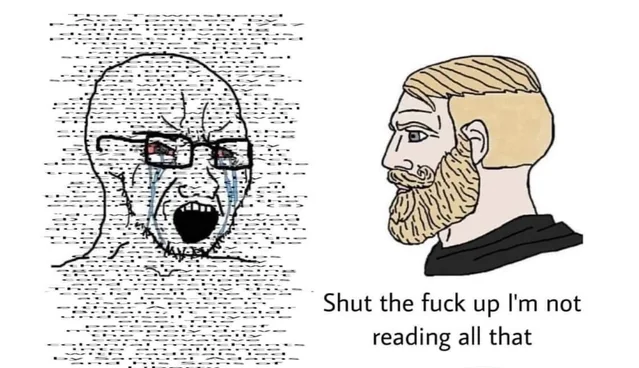 >>5948911 судя по высеру выше - это абзацедаун опять начал делать вид, что он чето понимает в этой игре, а значит в итоге все закончится хлопаньем дверей, показательным ливом из треда и скулежом о том, как проклятая моча его банит ни за что