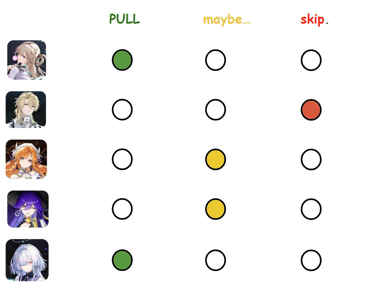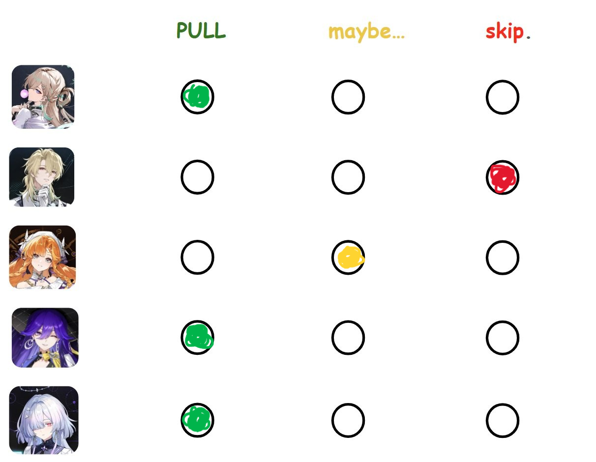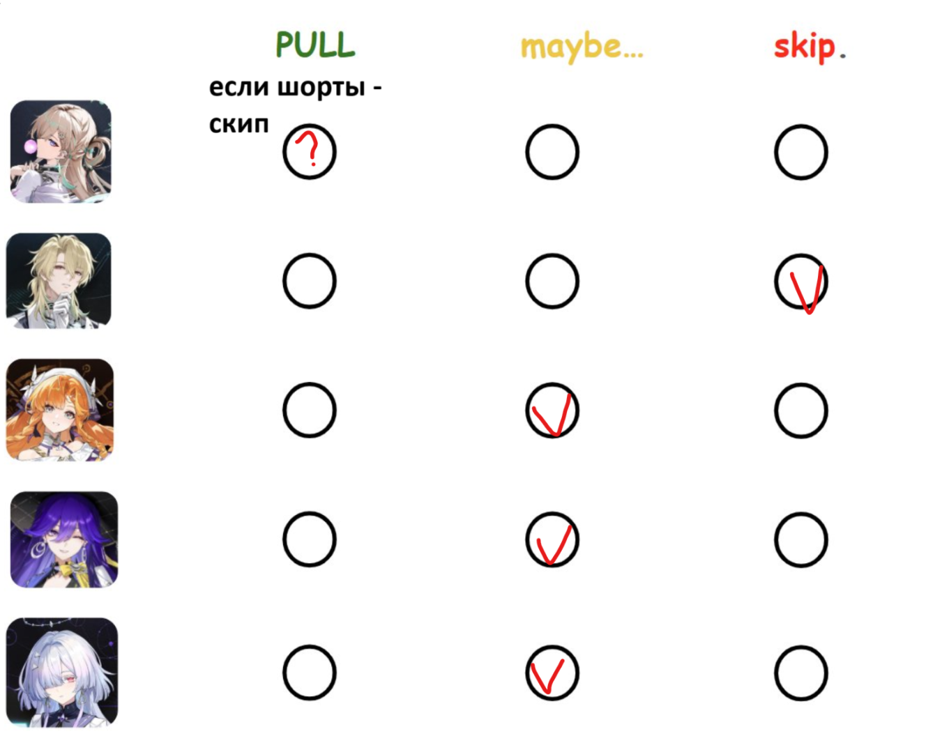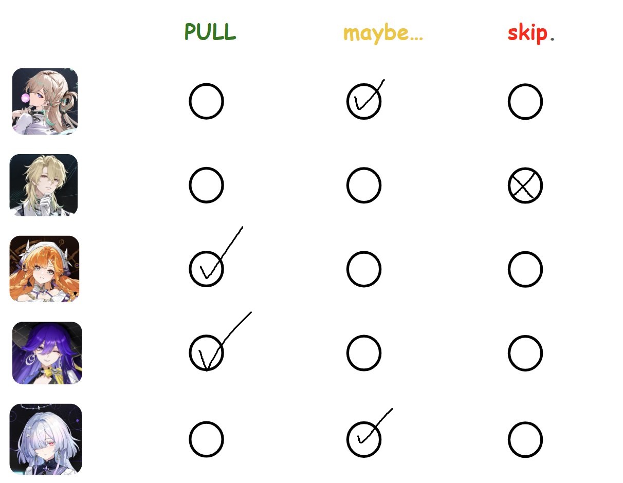 Бля, как же плохо то всё. Не то что бы я надеялся на что то, после Чисы. Но, я реально как дурачок поверил что у аутисточки будет лаконичный чёрно-белый костюмчик. А на деле, какое же говно... Она прям... хуёвая, опять эти висюльки, шторы, ленточки-хуенточки, повсюду. Даже нейро-ноги не такая проблема. Фиолетоволосая, просто рескин Сладкоушки, просто скип, это устаревший дизайн, и опять, нагромождение визуала. Рыжая эльфийка, да просто никакая, она настолько одинаково могла выйти в любой соседней гаче, потому что дизайн максимально общий. максимально дефолтный. Ну и остаётся блонди, но опять насрали курткой, под юбкой гигазаливка будет. Я просто даже хз, крутить или нет. Будет зависеть от элемента. Вообще, всё аэро инстаскип, Катьку и Юнону перебить невозможно до ЕОСа. На синему и игру это не повлияет, но думаю можно больше не заносить, кроме как на подписку. Уже 2-3 патча скипов намечается. Если только докручивать консты, что бы старых персов в актуалочке держать.