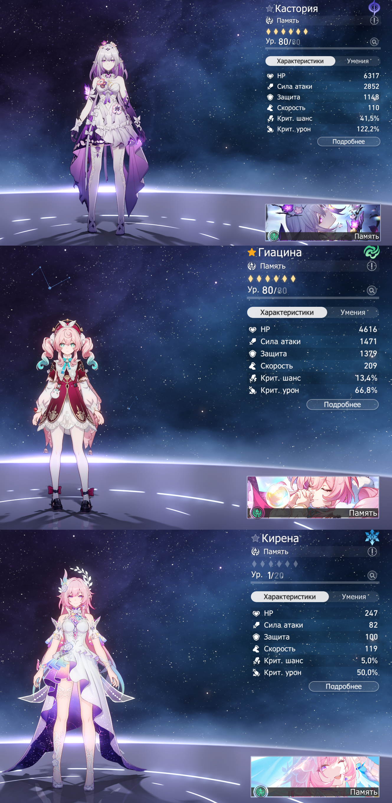 Что посоветуете? В принципе фулл пачка памяти есть, но она и без Кирены сильная (2 звезды на аномалии), а наличие Кирены не поможет закрыть аномали. на 3 звезды.