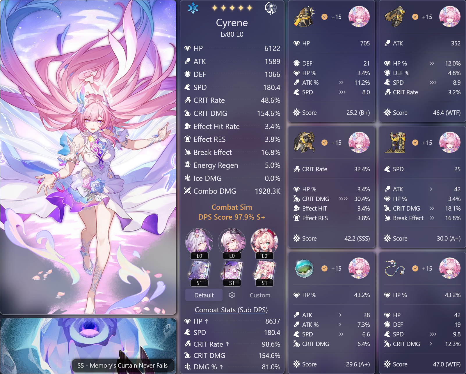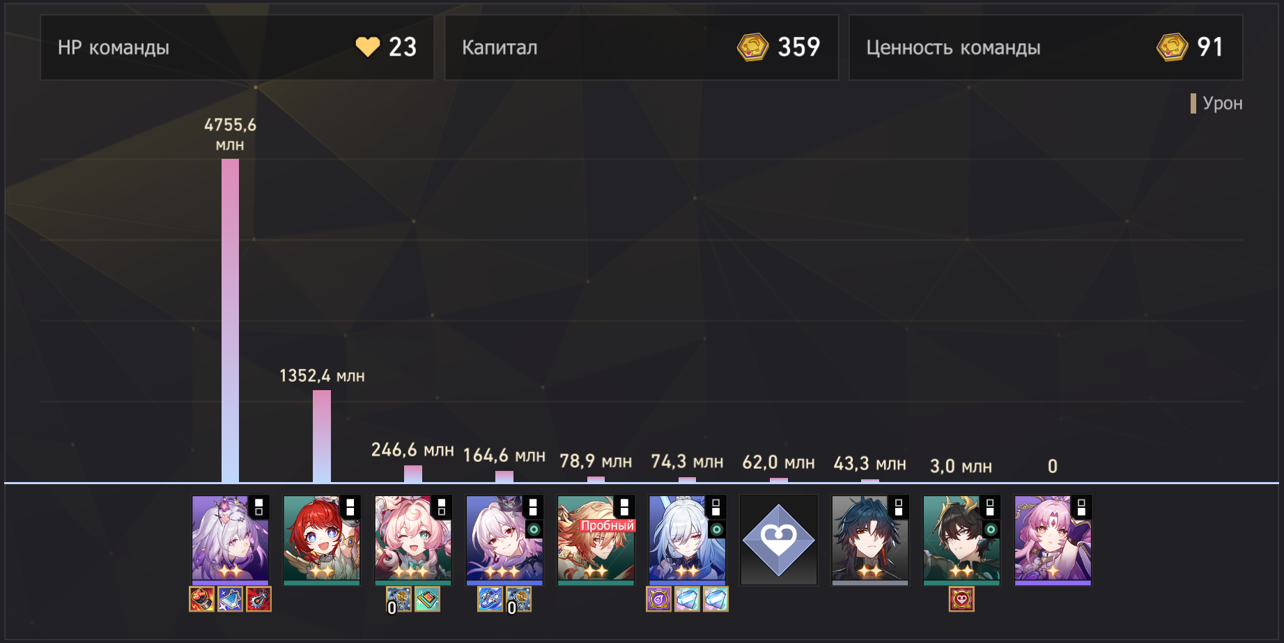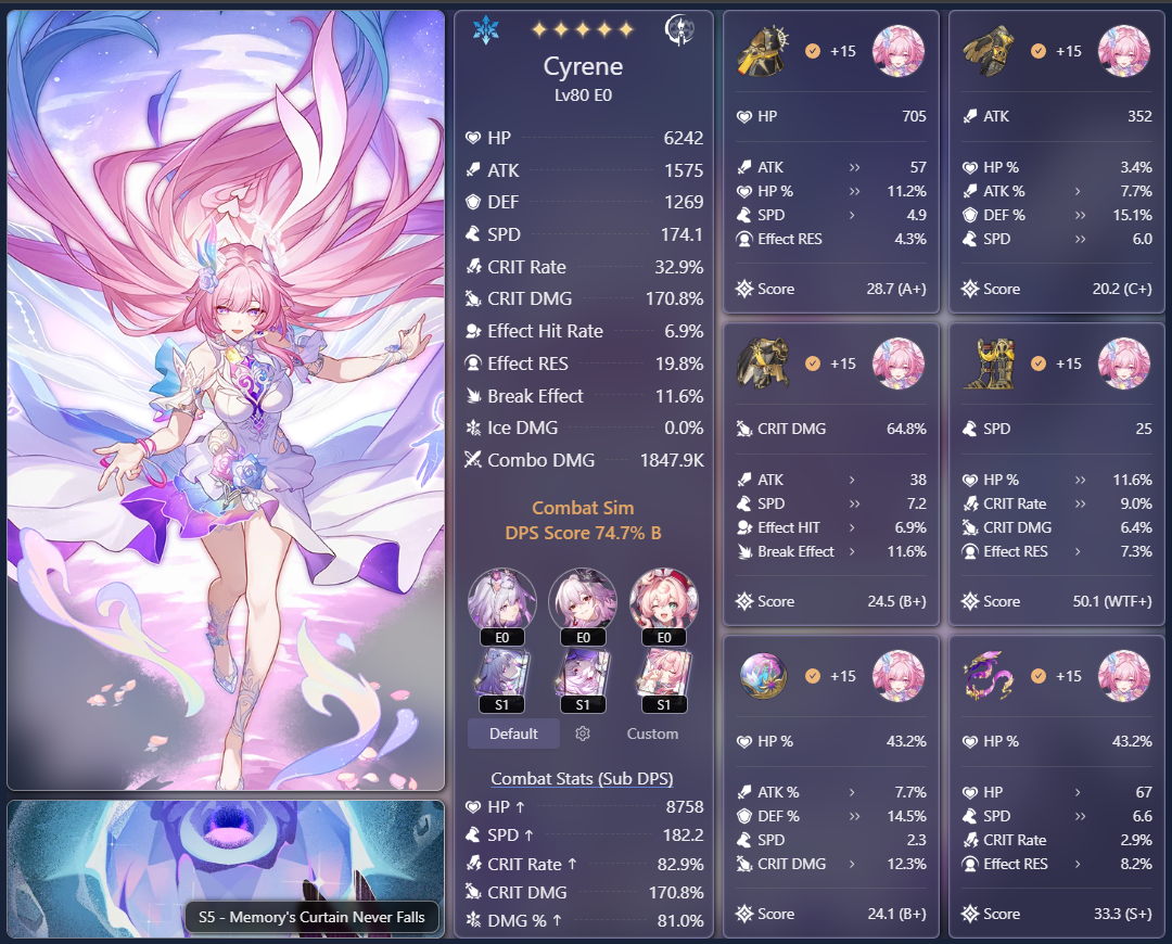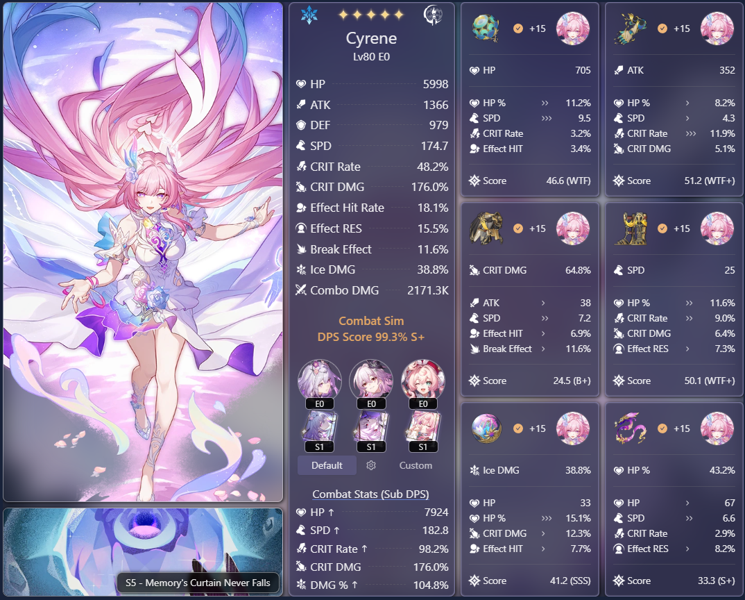 Если посмотреть сайт китайских доширачников у меня минимальный эффективный кост я имею ввиду сигноэйдолоны реально имеющие импакт, е1с1 Гис, е1 Кафка, е0 Кирена, е0 Данька без своей сигны на котором возможно золото этой пачкой. Единственная разница, там лучше релики, в основном Гисиленса быстрее на 8-10 скорости. Но я даже тупо не понимаю механику этого ебучего РНГ босса, она то рандомно убивает пачку, то не убивает, то дамажится, то не дамажится. Как это вообще работает блять.