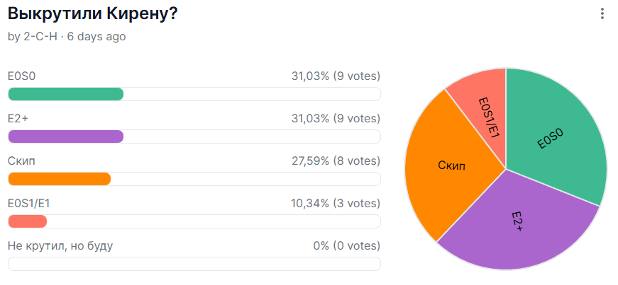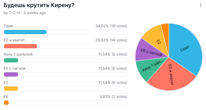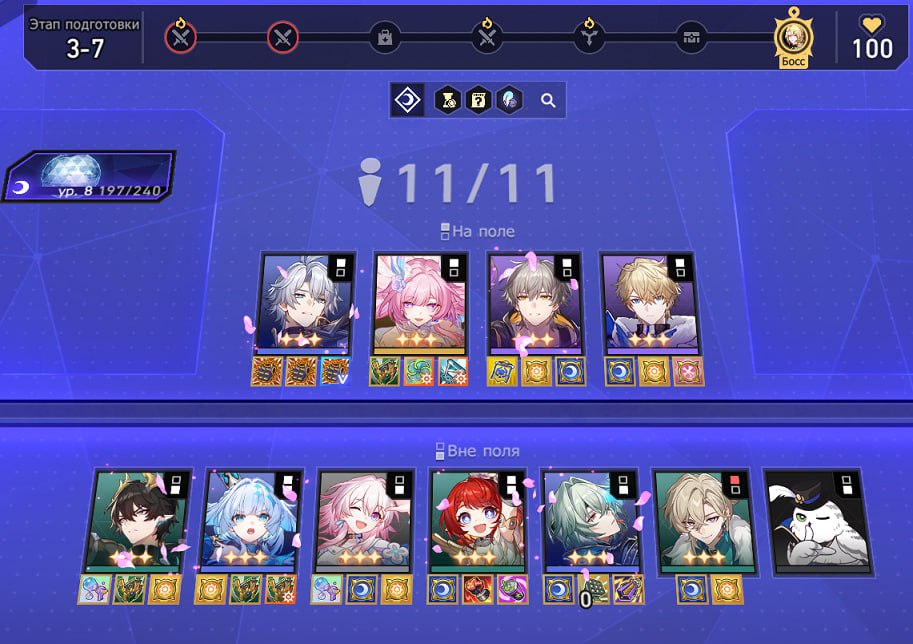 Вчера с утра переставил местами пару сигн Гиацины на Кирену, Фаенона на Данька, поправил релики, получил <20% хп на Калбитре. Охуел с такого результата, подумал близко, пошёл оптимизировать дальше ротацию, релики... в итоге убив на это полдня, проебав кучу материалов для крафта реликов, получил "улучшение" до остающихся в конце ~40-50% хп на боссе. Даже не знаю как хотя бы эту проходку на 20% повторить блять.