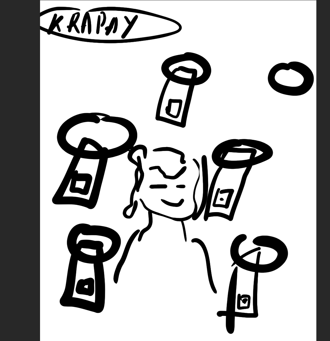 В принципе такие талоны с QR кодами из обручей-порталов, рядом символика Krap-Pay (плохо стилизованная), рядом банкомати для пополнения, и довольная героиня. Правда ничего на фон толком не придумывается, да и что отображать в порталах тоже не понятно.