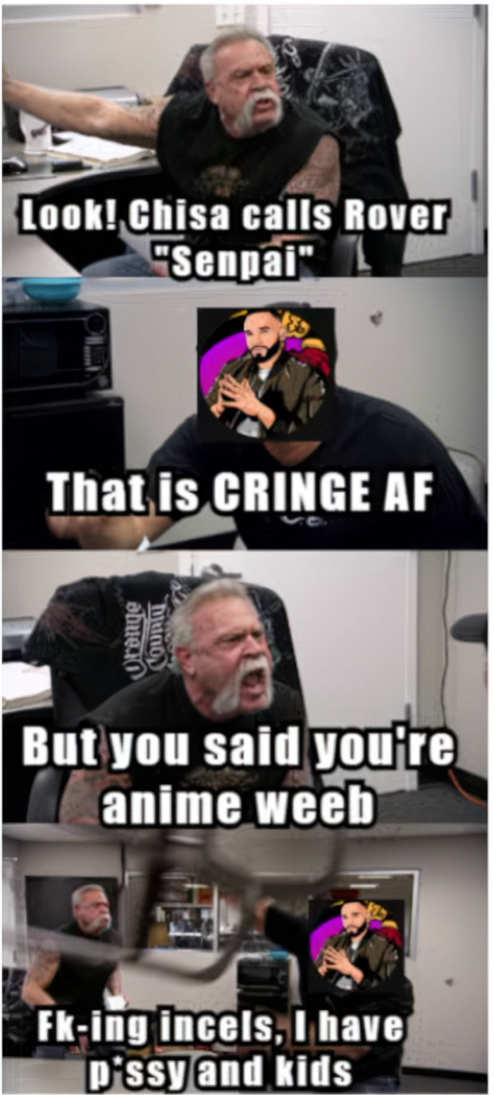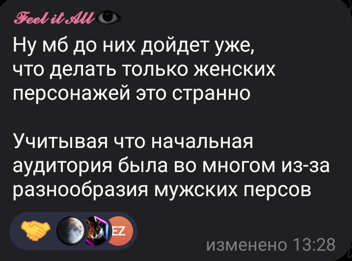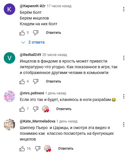 >>5957597 Какая же база в комментах, господи. Визжащие инцелы убивают игры точно так же как их убивает сжв-блм движуха, только тут вместо красоток и белых разраб боится вставить здоровые отношения. Просто потому что иначе припизднутый инцелёнок спрыгнет с крыши оставив предсмертную записку с обвинением в адрес гачадела. Прикиньте как похорошела бы Вува, если бы у Ровера был условный выбор кого определить себе в жёны (из лорно подходящих, типа ШК, Фроловой, Картефии, итп), а остальные персы имели бы здоровые отношения между собой. Такой мир сразу становится намного интереснее, потому что он намного правдоподобнее и в него больше веришь - больше погружения. Однажды так и будет, главное чтоб побыстрее.