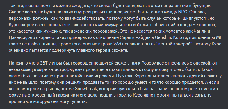 А вот лохайрой по сливам меня сильно настораживает. Вайбик хорайзона и продолжающаяся агуша ринаситы как основа игры и лора в целом для меня выглядит очень плохим решением. Агуша ринаситы была уместно как контраст. Но не как основная тема. А если сейчас все переиначат, то игра буквально превратится в калшит насрановский, откуда я сбежал в свое время сюда.