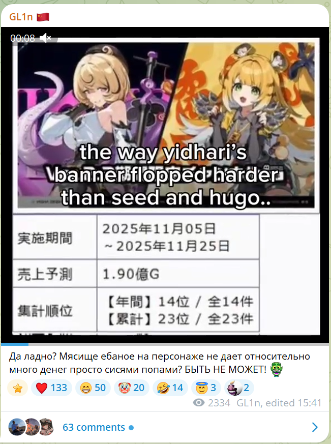 Я просто в ахуе с генитальности Ляо. Две игры убил тупо ЖАДНОСТЬЮ, причем мелкой - в Геншине захотел за регион дважды сливки снимать, на Архонте и на Суверене - и после толчка продажи не-имб просто сдулись нахуй, всё, если не SS-тир - то сразу в гроб, нахуй И здесь, блядь, выкакал однокнопочную Мияби - и всё, любой чемпик слабее её - сразу в отстойник "крутить по желанию" - так еще и Мияба душить начал, лол, а заодно почти весь каст 1.х, которые у прыжке до Безжопа не дотягивались