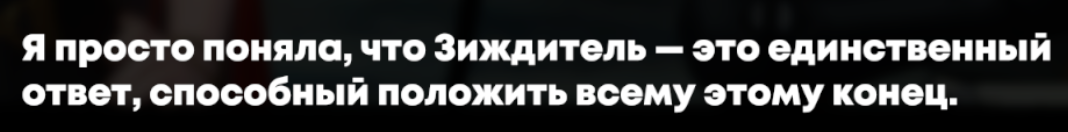 >>5989045 >У Сара травма, Сара попадает в секту и мстит, мстит не конкретной личности, а миропорядку Но она не мстит, она действительно думает, что зиждитель придет и создаст идеальный мир, где всем будет хорошо >Приведи пример Буквально сюжетка, с ней же зиждитель говорила