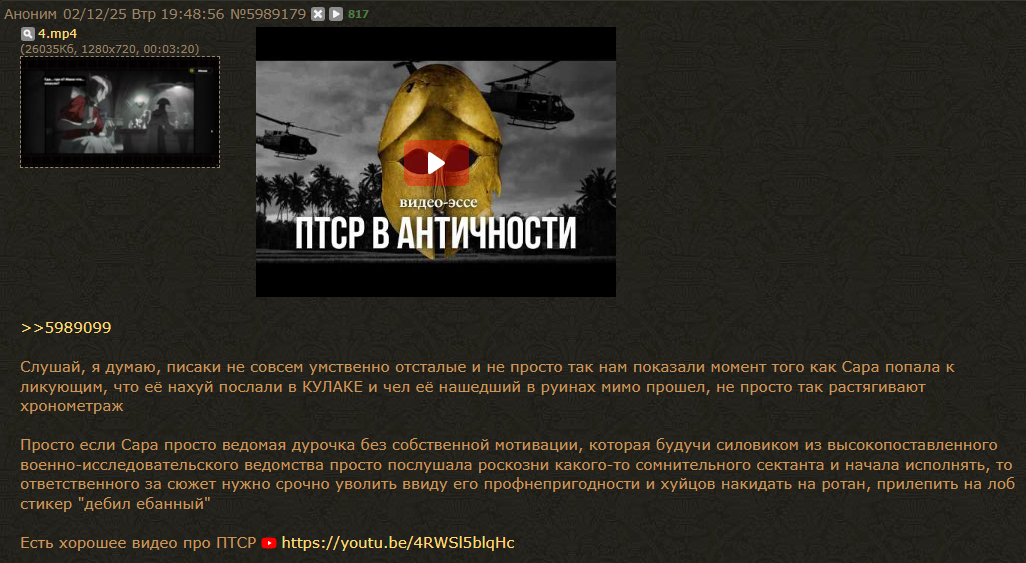 >>5988517 >гг довел её до слёз Ну не знаю. Наверное дело в том что очень сложно довести до слёз человека, который буквально живет в постапокалипсисе, где в любую секунду может произойти дзен-распад и тебя разорвёт на молекулы, где жизнь каждого человека это горы трупов, безысходность существования, чудовищное давление на психику, эфирные ебаки. Ну и ещё, сралфильдновувные чмондели никогда не увидят, как к ним в видеопрокат приходит толпа школьниц с требованием показать им порнуху.