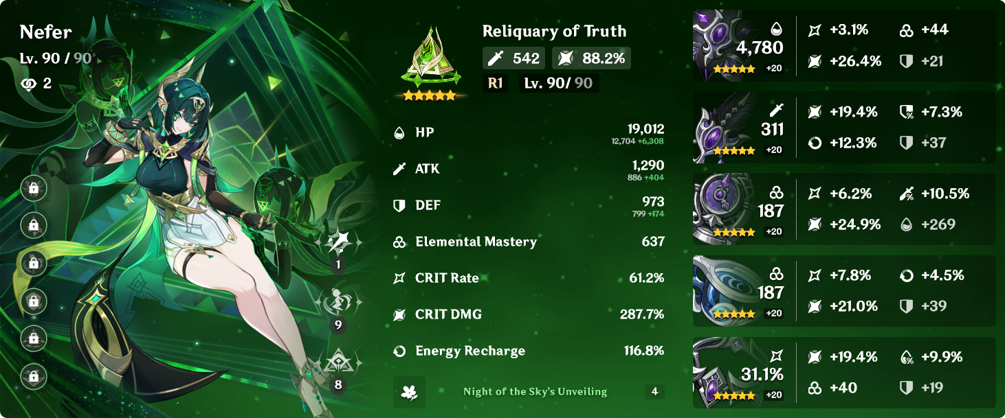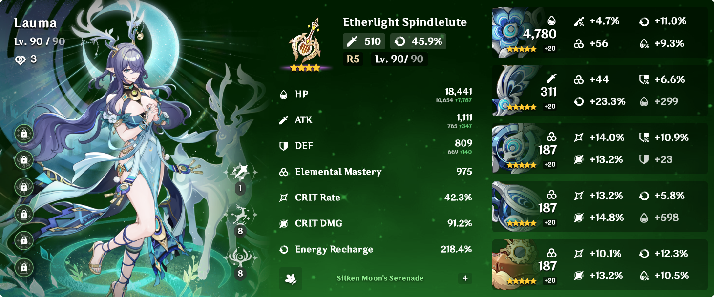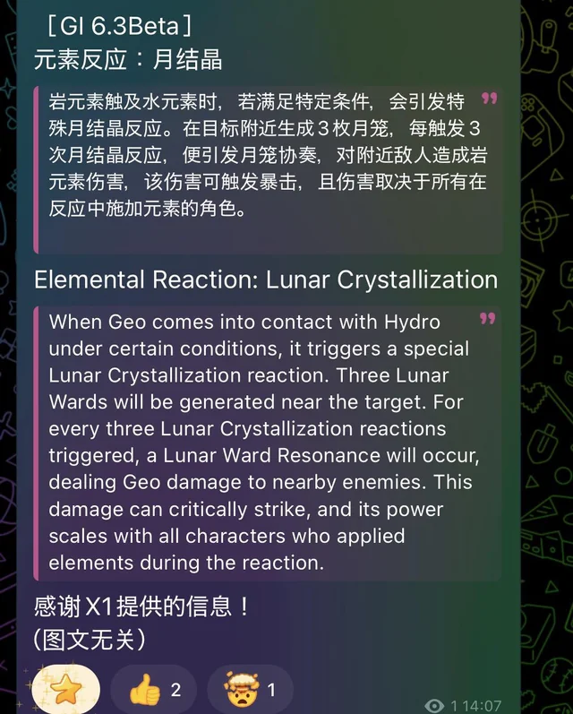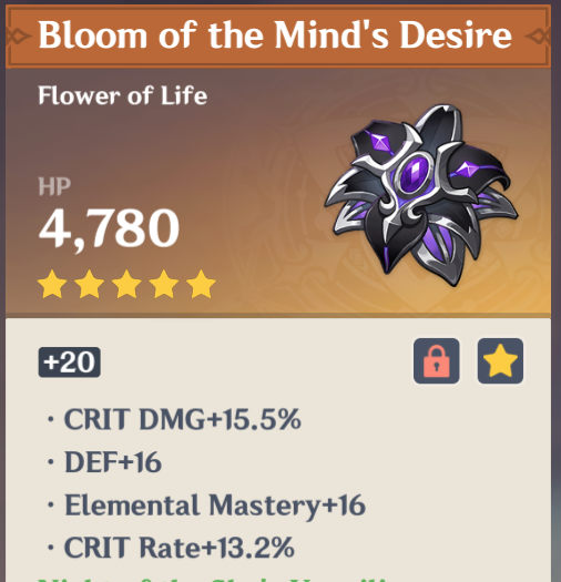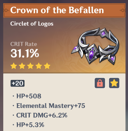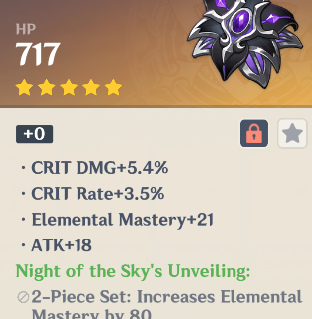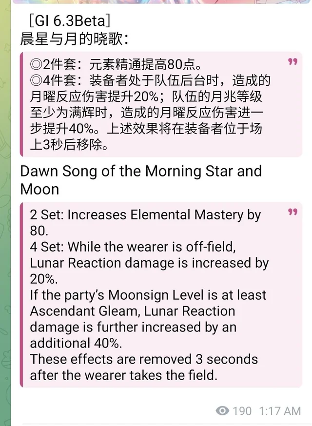 Dawn Song of the Morning Star and Moon 2 Set: Increases Elemental Mastery by 80. 4 Set: While the wearer is off-field, Lunar Reaction damage is increased by 20%. If the party’s Moonsign Level is at least Ascendant Gleam, Lunar Reaction damage is further increased by an additional 40%. These effects are removed 3 seconds after the wearer takes the field.