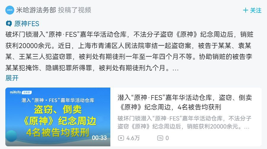 [Genshin] Four individuals broke the lock to break into a Hoyoverse Genshin FES warehouse in Shanghai, stole merchandise for resale (earning~2850usd), and were sentenced to prison terms ranging from nine months to one year and four months.