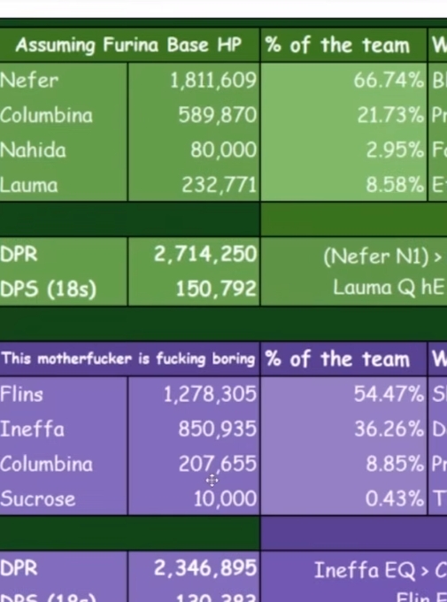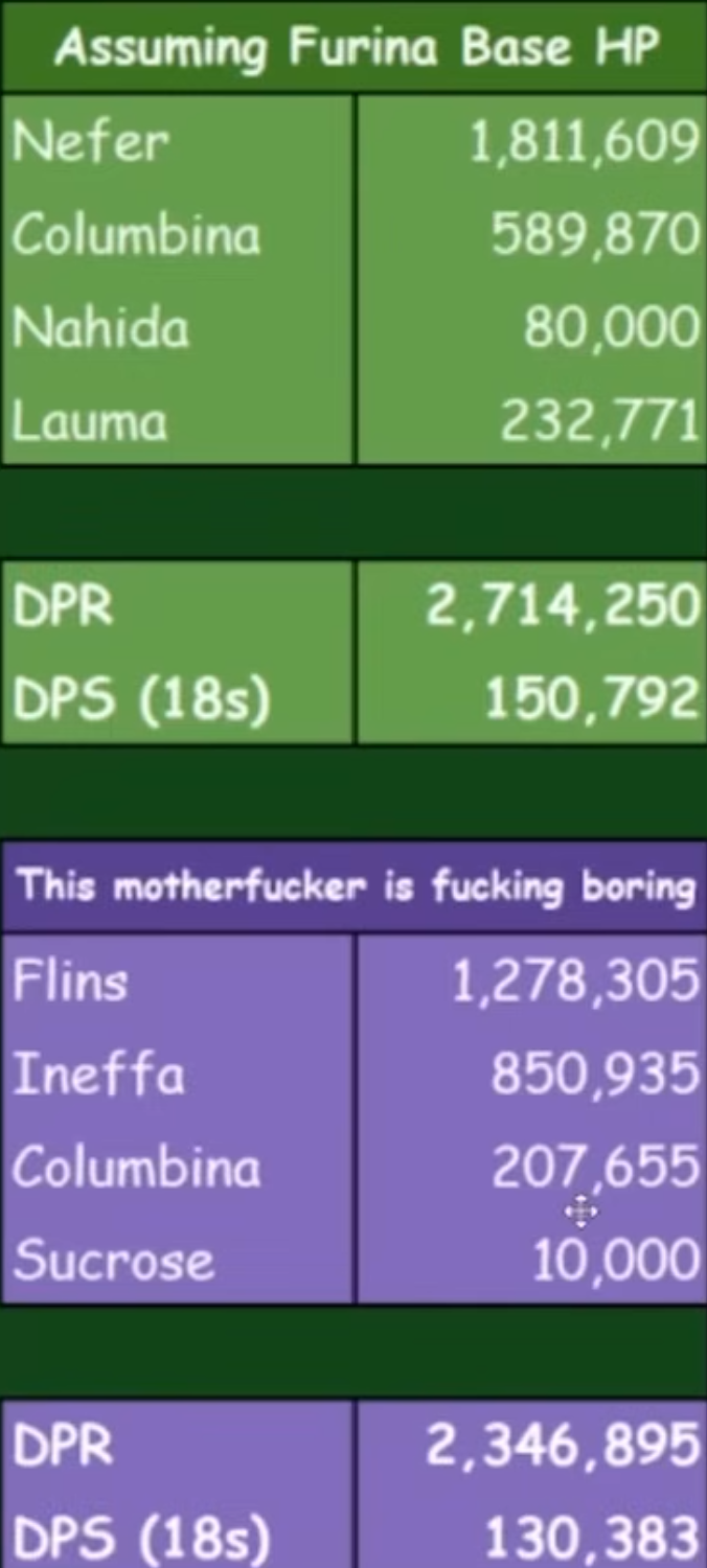 >>5990821 Они буквально одинаковые. Посмотри на дамага флинс+инеффа, и нефер+лабуба. Те же самые 2кк в обоих случая, просто немного разные пропорции - инеффа без флинса сильно полезней, чем лабуба без флинса. И я бы сказал что это преимущество скорей второй пачки, чем первой - сабдд дольше остаётся актуальным чем дд. А общий дамаг различается т.к. косты пачек разные, 4 леги vs 3 леги. Поменяй нахиду на какую-нибудь колей, и посчитай еще разок.
