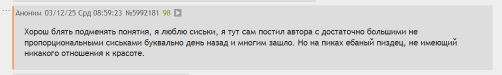 Хорош блять подменять понятия, я люблю сиськи, я тут сам постил автора с достаточно большими не пропорциональными сиськами буквально день назад и многим зашло. Но на пиках ебаный пиздец, не имеющий никакого отношения к красоте.