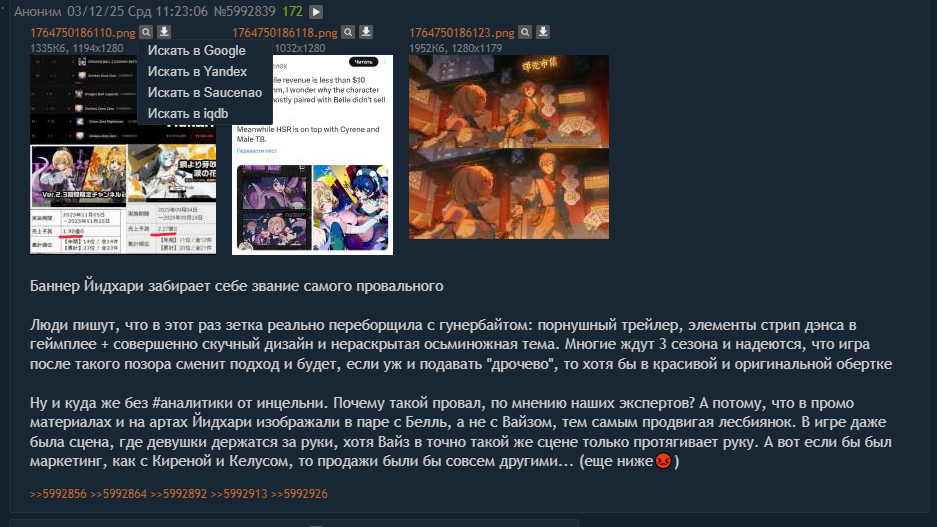 Ну и куда же без #аналитики от инцельни. Почему такой провал, по мнению наших экспертов? А потому, что в промо материалах и на артах Йидхари изображали в паре с Белль, а не с Вайзом, тем самым продвигая лесбиянок. В игре даже была сцена, где девушки держатся за руки, хотя Вайз в точно такой же сцене только протягивает руку. А вот если бы был маркетинг, как с Киреной и Келусом, то продажи были бы совсем другими... (еще ниже😡)