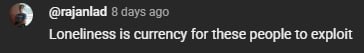 >>5993681 Это не "плохо", это сделано топорно и халтурно. Для подростков и детей ещё ладно, они просто ещё мало видели, впечатлительные, и готовы на все от любого внимания. Но когда у 25+ индивида нехватка человеческой близости настолько что им это кажется "охуенным, вау, бегу крутить жену", если это конечно всерьез, то это очень печально как по мне. К самим разрабам и игре у меня нет претензий, они просто деньги тянут с самых уязвимых людей, у них бизнес, а кто-то должен платить за работу разрабов.